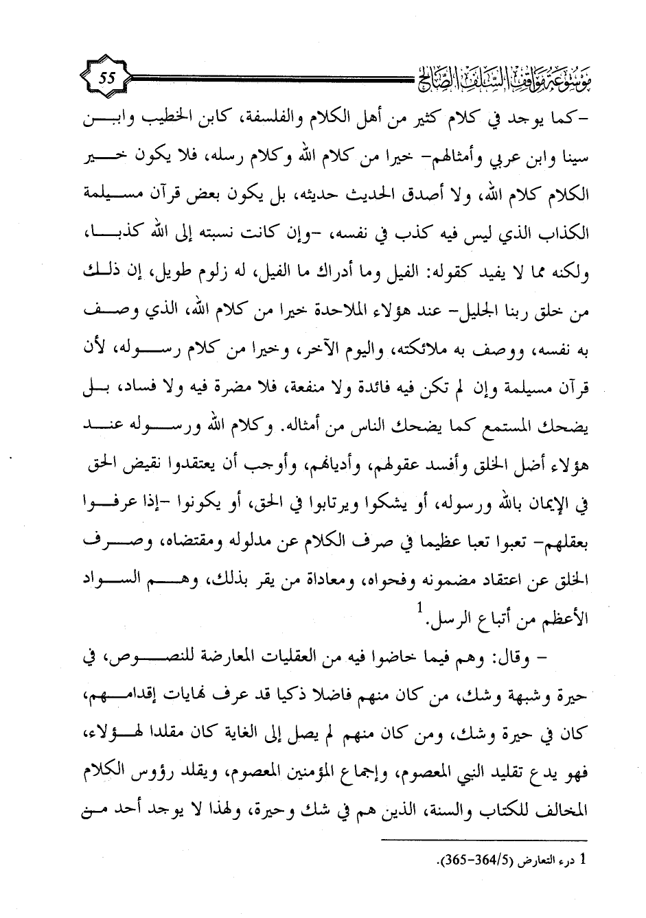 -كما يوجد في كلام كثير من أهل الكلام والفلسفة، كابن الخطيب وابن سينا وابن عربي وأمثالهم- خيرا من كلام الله وكلام رسله، فلا يكون خير الكلام كلام الله، ولا أصدق الحديث حديثه، بل يكون بعض قرآن مسيلمة الكذاب الذي ليس فيه كذب في نفسه، -وإن كانت نسبته إلى الله كذبا، ولكنه مما لا يفيد كقوله: الفيل وما أدراك ما الفيل، له زلوم طويل، إن ذلك من خلق ربنا الجليل- عند هؤلاء الملاحدة خيرا من كلام الله، الذي وصف به نفسه، ووصف به ملائكته، واليوم الآخر، وخيرا من كلام رسوله، لأن قرآن مسيلمة وإن لم تكن فيه فائدة ولا منفعة، فلا مضرة فيه ولا فساد، بل يضحك المستمع كما يضحك الناس من أمثاله. وكلام الله ورسوله عند هؤلاء أضل الخلق وأفسد عقولهم، وأديانهم، وأوجب أن يعتقدوا نقيض الحق في الإيمان بالله ورسوله، أو يشكوا ويرتابوا في الحق، أو يكونوا -إذا عرفوا بعقلهم- تعبوا تعبا عظيما في صرف الكلام عن مدلوله ومقتضاه، وصرف الخلق عن اعتقاد مضمونه وفحواه، ومعاداة من يقر بذلك، وهم السواد الأعظم من أتباع الرسل. (¬1)