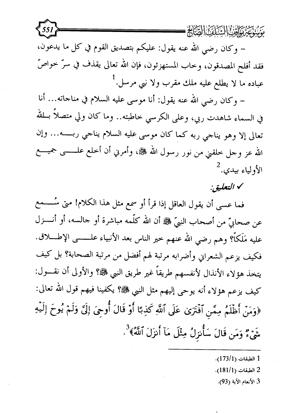 فما عسى أن يقول العاقل إذا قرأ أو سمع مثل هذا الكلام! متى سُمع عن صحابيّ من أصحاب النبيّ - صلى الله عليه وسلم - أن الله كلّمه مباشرة أو جالسه، أو أنزل عليه مَلَكاً؟ وهم رضي الله عنهم خير الناس بعد الأنبياء على الإطلاق. فكيف يزعم الشعراني وأضرابه مرتبة لهم أفضل من مرتبة الصحابة؟ بل كيف يتخذ هؤلاء الأنذال لأنفسهم طريقاً غير طريق النبي - صلى الله عليه وسلم -؟ والأولى أن نقول: كيف يزعم هؤلاء أنه يوحى إليهم مثل النبي - صلى الله عليه وسلم -؟ يكفينا فيهم قول الله تعالى: {وَمَنْ أَظْلَمُ مِمَّنِ افْتَرَى عَلَى اللَّهِ كَذِبًا أَوْ قَالَ أُوحِيَ إِلَيَّ وَلَمْ يُوحَ إِلَيْهِ شَيْءٌ وَمَنْ قَالَ سَأُنْزِلُ مِثْلَ مَا أَنْزَلَ اللَّهُ} (¬3).