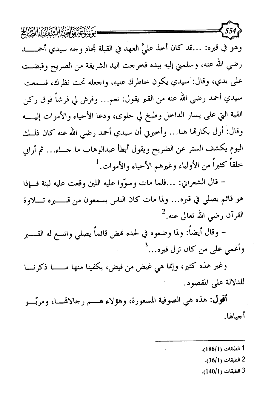 وهو في قبره: ... قد كان أخذ عليَّ العهد في القبلة تجاه وجه سيدي أحمد رضي الله عنه، وسلمني إليه بيده فخرجت اليد الشريفة من الضريح وقبضت على يدي، وقال: سيدي يكون خاطرك عليه، واجعله تحت نظرك، فسمعت سيدي أحمد رضي الله عنه من القبر يقول: نعم ... وفرش لي فرشاً فوق ركن القبة التي على يسار الداخل وطبخ لي حلوى، ودعا الأحياء والأموات إليه وقال: أزل بكارتها هنا ... وأخبرني أن سيدي أحمد رضي الله عنه كان ذلك اليوم يكشف الستر عن الضريح ويقول أبطأ عبد الوهاب ما جاء ... ثم أراني خلقاً كثيراً من الأولياء وغيرهم الأحياء والأموات. (¬1)
