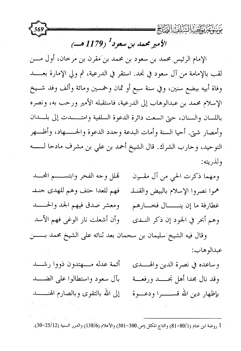 الإمام الرئيس محمد بن سعود بن محمد بن مقرن بن مرخان، أول من لقب بالإمامة من آل سعود في نجد. استقر في الدرعية، ثم ولي الإمارة بعد وفاة أبيه ببضع سنين، وفي سنة سبع أو ثمان وخمسين ومائة وألف وفد شيخ الإسلام محمد بن عبد الوهاب إلى الدرعية، فاستقبله الأمير ورحب به، ونصره باللسان والسنان، حتى اتسعت دائرة الدعوة السلفية وامتدت إلى بلدان وأمصار شتى. أحيا السنة وأمات البدعة وجدد الدعوة والجهاد، وأظهر التوحيد، وحارب الشرك. قال الشيخ أحمد بن علي بن مشرف مادحا له ولذريته: