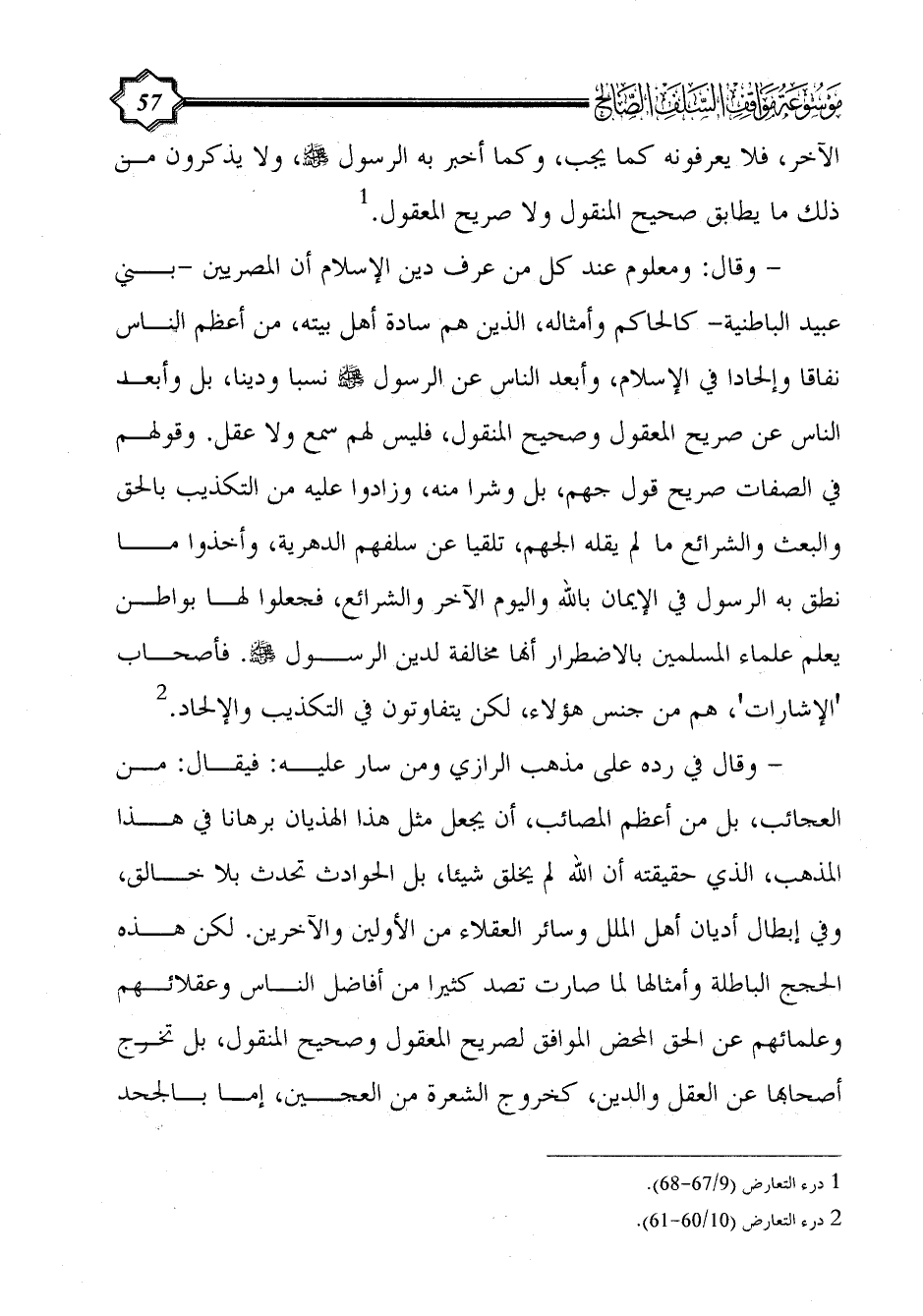 - وقال في رده على مذهب الرازي ومن سار عليه: فيقال: من العجائب، بل من أعظم المصائب، أن يجعل مثل هذا الهذيان برهانا في هذا المذهب، الذي حقيقته أن الله لم يخلق شيئا، بل الحوادث تحدث بلا خالق، وفي إبطال أديان أهل الملل وسائر العقلاء من الأولين والآخرين. لكن هذه الحجج الباطلة وأمثالها لما صارت تصد كثيرا من أفاضل الناس وعقلائهم وعلمائهم عن الحق المحض الموافق لصريح المعقول وصحيح المنقول، بل تخرج أصحابها عن العقل والدين، كخروج الشعرة من العجين، إما بالجحد