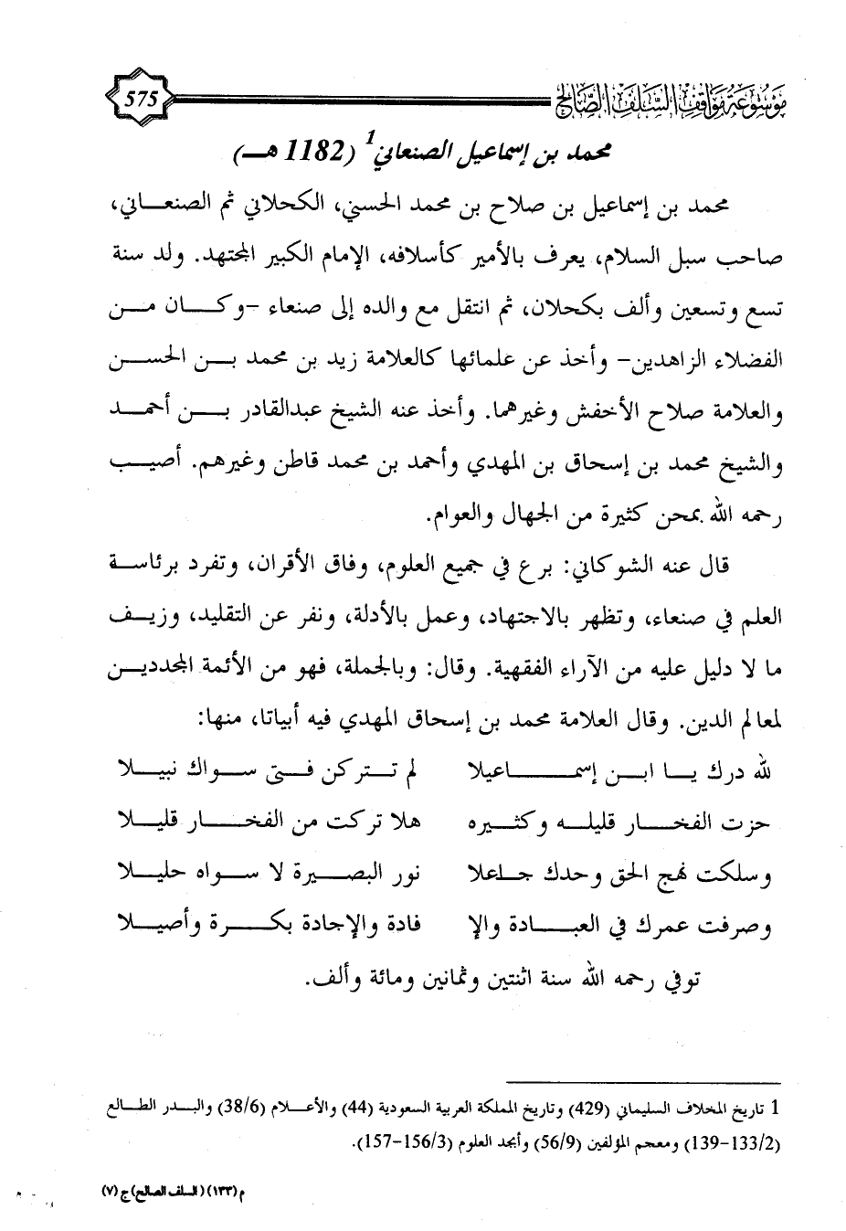 محمد بن إسماعيل بن صلاح بن محمد الحسني، الكحلاني ثم الصنعاني، صاحب سبل السلام، يعرف بالأمير كأسلافه، الإمام الكبير المجتهد. ولد سنة تسع وتسعين وألف بكحلان، ثم انتقل مع والده إلى صنعاء -وكان من الفضلاء الزاهدين- وأخذ عن علمائها كالعلامة زيد بن محمد بن الحسن والعلامة صلاح الأخفش وغيرهما. وأخذ عنه الشيخ عبد القادر بن أحمد والشيخ محمد بن إسحاق بن المهدي وأحمد بن محمد قاطن وغيرهم. أصيب رحمه الله بمحن كثيرة من الجهال والعوام.