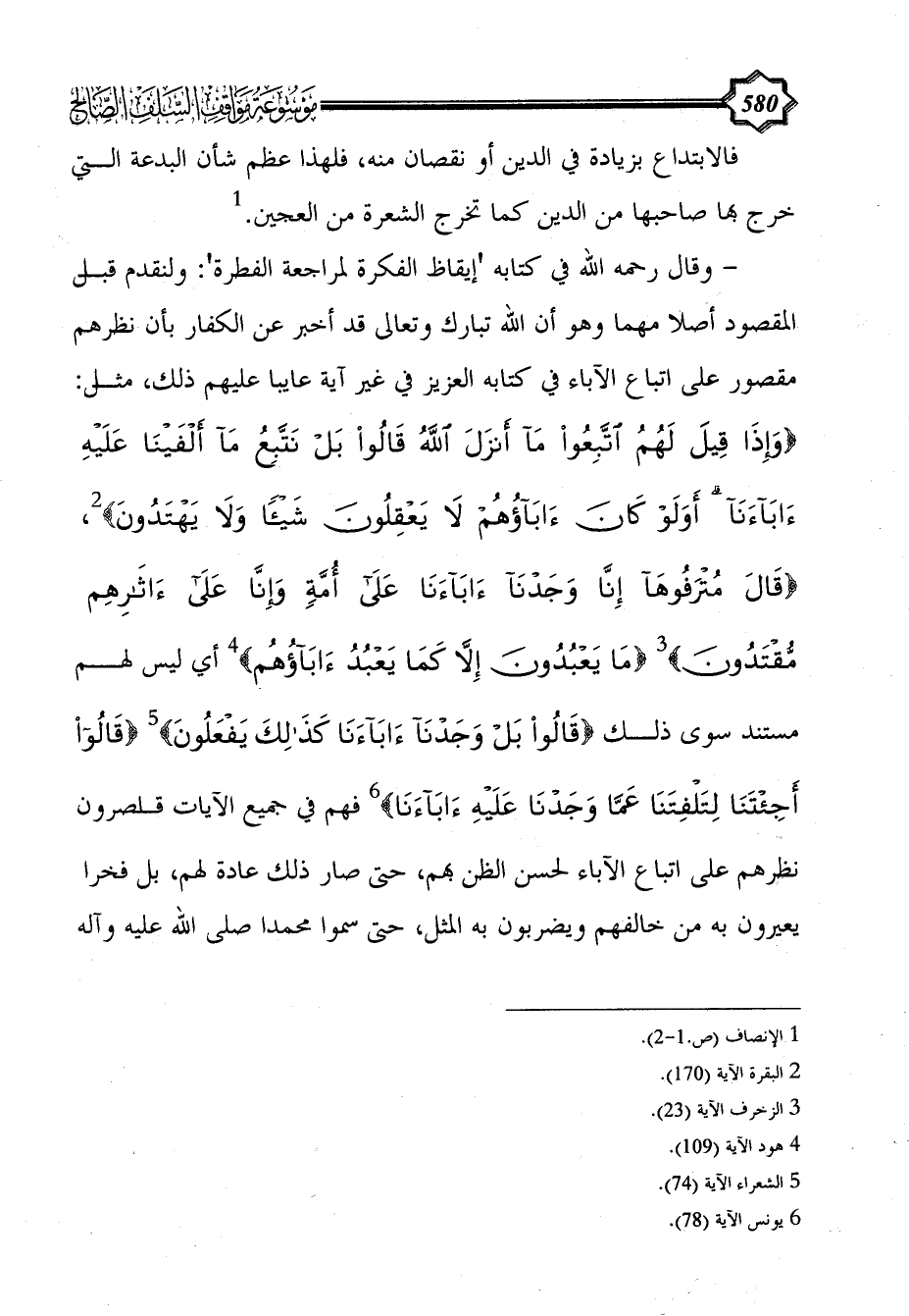 - وقال رحمه الله في كتابه 'إيقاظ الفكرة لمراجعة الفطرة': ولنقدم قبل المقصود أصلا مهما وهو أن الله تبارك وتعالى قد أخبر عن الكفار بأن نظرهم مقصور على اتباع الآباء في كتابه العزيز في غير آية عايبا عليهم ذلك، مثل: {وَإِذَا قِيلَ لَهُمُ اتَّبِعُوا مَا أَنْزَلَ اللَّهُ قَالُوا بَلْ نَتَّبِعُ مَا أَلْفَيْنَا عَلَيْهِ آَبَاءَنَا أَوَلَوْ كَانَ آَبَاؤُهُمْ لَا يَعْقِلُونَ شَيْئًا وَلَا يَهْتَدُونَ} (¬2)، {قَالَ مُتْرَفُوهَا إِنَّا وَجَدْنَا آَبَاءَنَا عَلَى أُمَّةٍ وَإِنَّا عَلَى آَثَارِهِمْ مُقْتَدُونَ} (¬3) {مَا يَعْبُدُونَ إِلَّا كَمَا يَعْبُدُ آَبَاؤُهُمْ} (¬4) أي ليس لهم مستند سوى ذلك {قَالُوا بَلْ وَجَدْنَا آَبَاءَنَا كَذَلِكَ يَفْعَلُونَ} (¬5) {قَالُوا أَجِئْتَنَا لِتَلْفِتَنَا عَمَّا وَجَدْنَا عَلَيْهِ آَبَاءَنَا} (¬6) فهم في جميع الآيات قاصرون نظرهم على اتباع الآباء لحسن الظن بهم، حتى صار ذلك عادة لهم، بل فخرا يعيرون به من خالفهم ويضربون به المثل، حتى سموا محمدا صلى الله عليه وآله