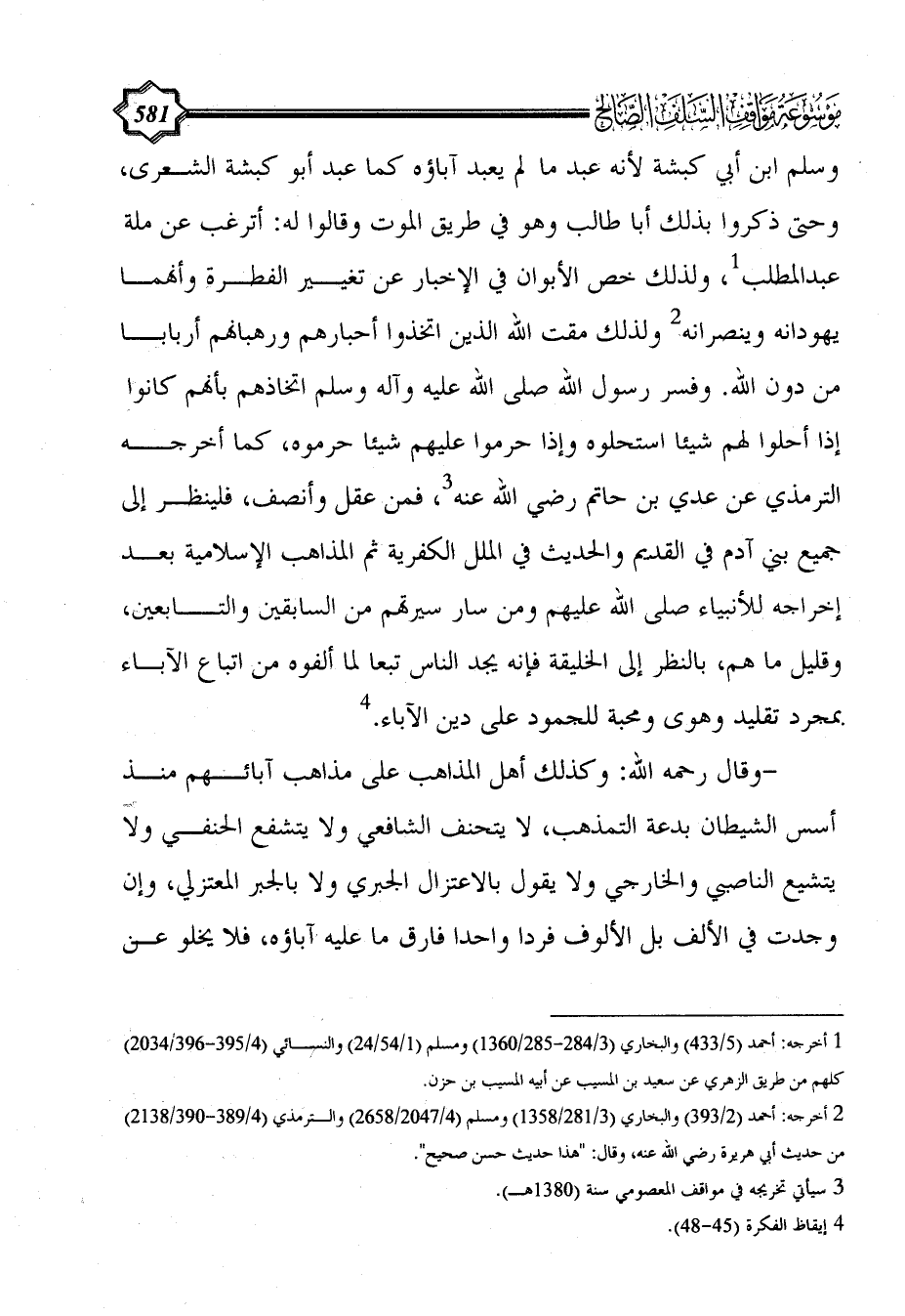 ولذلك مقت الله الذين اتخذوا أحبارهم ورهبانهم أربابا من دون الله. وفسر رسول الله صلى الله عليه وآله وسلم اتخاذهم بأنهم كانوا إذا أحلوا لهم شيئا استحلوه وإذا حرموا عليهم شيئا حرموه، كما أخرجه الترمذي عن عدي بن حاتم رضي الله عنه (¬3)، فمن عقل وأنصف، فلينظر إلى جميع بني آدم في القديم والحديث في الملل الكفرية ثم المذاهب الإسلامية بعد إخراجه للأنبياء صلى الله عليهم ومن سار سيرتهم من السابقين والتابعين، وقليل ما هم، بالنظر إلى الخليقة فإنه يجد الناس تبعا لما ألفوه من اتباع الآباء بمجرد تقليد وهوى ومحبة للجمود على دين الآباء. (¬4)