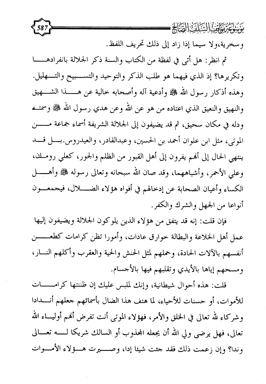 ثم انظر: هل أتى في لفظة من الكتاب والسنة ذكر الجلالة بانفرادها وتكريرها؟ إذ الذي فيهما هو طلب الذكر والتوحيد والتسبيح والتهليل. وهذه أذكار رسول الله - صلى الله عليه وسلم - وأدعية آله وأصحابه خالية عن هذا الشهيق والنهيق والنعيق الذي اعتاده من هو عن الله وعن هدي رسول الله - صلى الله عليه وسلم - وسمته ودله في مكان سحيق، ثم قد يضيفون إلى الجلالة الشريفة أسماء جماعة من الموتى، مثل ابن علوان أحمد بن الحسين، وعبد القادر، والعيدروس. بل قد ينتهي الحال إلى أنهم يفرون إلى أهل القبور من الظلم والجور، كعلي رومان، وعلي الأحمر، وأشباههما، وقد صان الله سبحانه وتعالى رسوله - صلى الله عليه وسلم - وأهل الكساء وأعيان الصحابة عن إدخالهم في أفواه هؤلاء الضلال، فيجمعون أنواعا من الجهل والشرك والكفر.