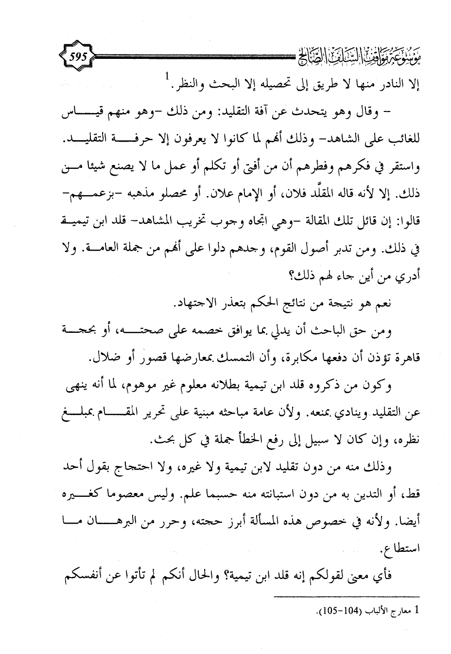 - وقال وهو يتحدث عن آفة التقليد: ومن ذلك -وهو منهم قياس للغائب على الشاهد- وذلك أنهم لما كانوا لا يعرفون إلا حرفة التقليد. واستقر في فكرهم وفطرهم أن من أفتى أو تكلم أو عمل ما لا يصنع شيئا من ذلك. إلا لأنه قاله المقلَّد فلان، أو الإمام علان. أو محصلو مذهبه -بزعمهم- قالوا: إن قائل تلك المقالة -وهي اتجاه وجوب تخريب المشاهد- قلد ابن تيمية في ذلك. ومن تدبر أصول القوم، وجدهم دلوا على أنهم من جملة العامة. ولا أدري من أين جاء لهم ذلك؟