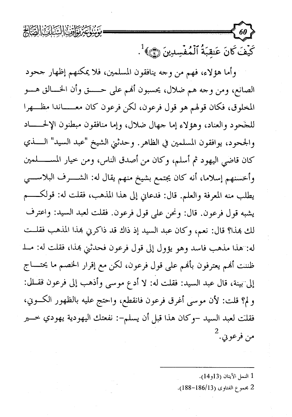 وأما هؤلاء، فهم من وجه ينافقون المسلمين، فلا يمكنهم إظهار جحود الصانع، ومن وجه هم ضلال، يحسبون أنهم على حق وأن الخالق هو المخلوق، فكان قولهم هو قول فرعون، لكن فرعون كان معاندا مظهرا للجحود والعناد، وهؤلاء إما جهال ضلال، وإما منافقون مبطنون الإلحاد والجحود، يوافقون المسلمين في الظاهر. وحدثني الشيخ "عبد السيد" الذي كان قاضي اليهود ثم أسلم، وكان من أصدق الناس، ومن خيار المسلمين وأحسنهم إسلاما، أنه كان يجتمع بشيخ منهم يقال له: الشرف البلاسي يطلب منه المعرفة والعلم. قال: فدعاني إلى هذا المذهب، فقلت له: قولكم يشبه قول فرعون. قال: ونحن على قول فرعون. فقلت لعبد السيد: واعترف لك بهذا؟ قال: نعم، وكان عبد السيد إذ ذاك قد ذاكرني بهذا المذهب فقلت له: هذا مذهب فاسد وهو يؤول إلى قول فرعون فحدثني بهذا، فقلت له: ما ظننت أنهم يعترفون بأنهم على قول فرعون، لكن مع إقرار الخصم ما يحتاج إلى بينة، قال عبد السيد: فقلت له: لا أدع موسى وأذهب إلى فرعون فقال: ولم؟ قلت: لأن موسى أغرق فرعون فانقطع، واحتج عليه بالظهور الكوني، فقلت لعبد السيد -وكان هذا قبل أن يسلم-: نفعتك اليهودية يهودي خير من فرعوني. (¬2)