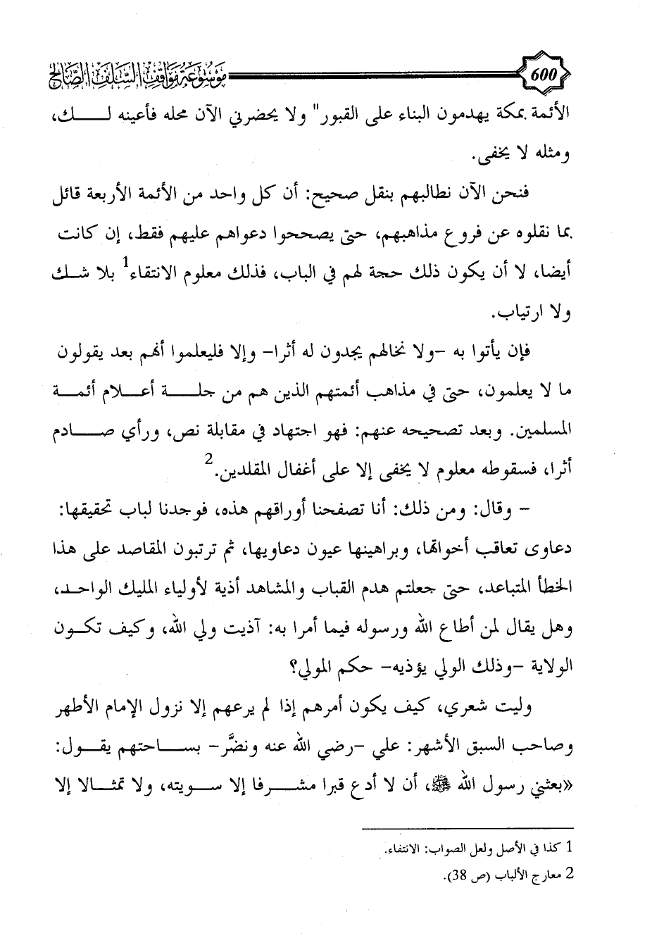 - وقال: ومن ذلك: أنا تصفحنا أوراقهم هذه، فوجدنا لباب تحقيقها: دعاوى تعاقب أخواتها، وبراهينها عيون دعاويها، ثم ترتبون المقاصد على هذا الخطأ المتباعد، حتى جعلتم هدم القباب والمشاهد أذية لأولياء المليك الواحد، وهل يقال لمن أطاع الله ورسوله فيما أمرا به: آذيت ولي الله، وكيف تكون الولاية -وذلك الولي يؤذيه- حكم المولي؟