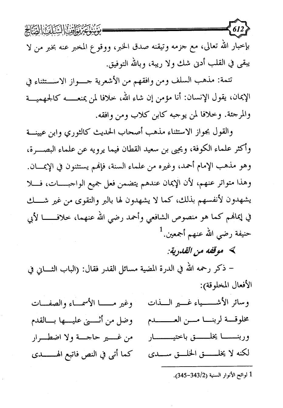 تتمة: مذهب السلف ومن وافقهم من الأشعرية جواز الاستثناء في الإيمان، يقول الإنسان: أنا مؤمن إن شاء الله، خلافا لمن يمنعه كالجهمية والمرجئة. وخلافا لمن يوجبه كابن كلاب ومن وافقه.