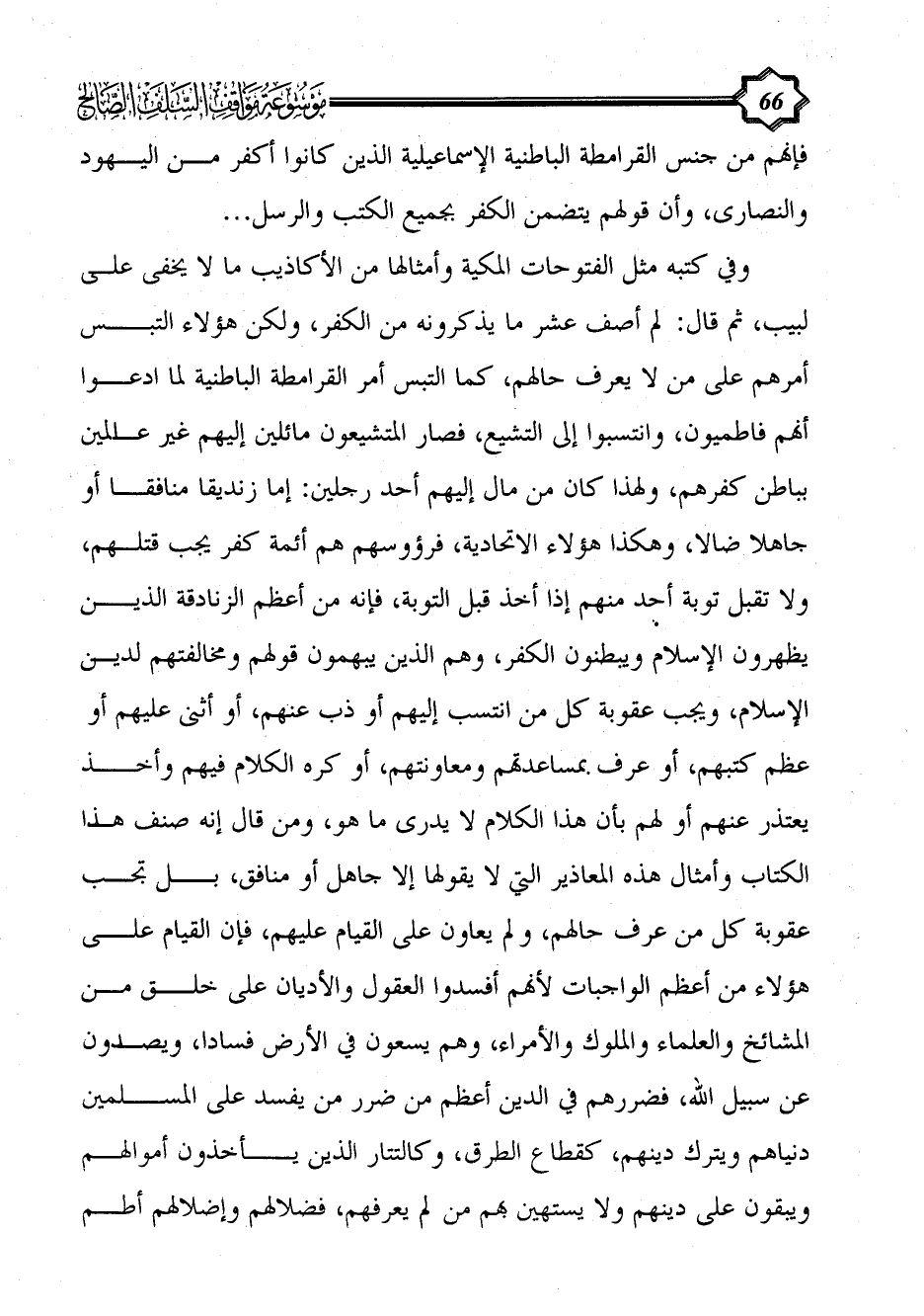وفي كتبه مثل الفتوحات المكية وأمثالها من الأكاذيب ما لا يخفى على لبيب، ثم قال: لم أصف عشر ما يذكرونه من الكفر، ولكن هؤلاء التبس أمرهم على من لا يعرف حالهم، كما التبس أمر القرامطة الباطنية لما ادعوا أنهم فاطميون، وانتسبوا إلى التشيع، فصار المتشيعون مائلين إليهم غير عالمين بباطن كفرهم، ولهذا كان من مال إليهم أحد رجلين: إما زنديقا منافقا أو جاهلا ضالا، وهكذا هؤلاء الاتحادية، فرؤوسهم هم أئمة كفر يجب قتلهم، ولا تقبل توبة أحد منهم إذا أخذ قبل التوبة، فإنه من أعظم الزنادقة الذين يظهرون الإسلام ويبطنون الكفر، وهم الذين يبهمون قولهم ومخالفتهم لدين الإسلام، ويجب عقوبة كل من انتسب إليهم أو ذب عنهم، أو أثنى عليهم أو عظم كتبهم، أو عرف بمساعدتهم ومعاونتهم، أو كره الكلام فيهم وأخذ يعتذر عنهم أو لهم بأن هذا الكلام لا يدرى ما هو، ومن قال إنه صنف هذا الكتاب وأمثال هذه المعاذير التي لا يقولها إلا جاهل أو منافق، بل تجب عقوبة كل من عرف حالهم، ولم يعاون على القيام عليهم، فإن القيام على هؤلاء من أعظم الواجبات لأنهم أفسدوا العقول والأديان على خلق من المشائخ والعلماء والملوك والأمراء، وهم يسعون في الأرض فسادا، ويصدون عن سبيل الله، فضررهم في الدين أعظم من ضرر من يفسد على المسلمين دنياهم ويترك دينهم، كقطاع الطرق، وكالتتار الذين يأخذون أموالهم ويبقون على دينهم ولا يستهين بهم من لم يعرفهم، فضلالهم وإضلالهم أطم