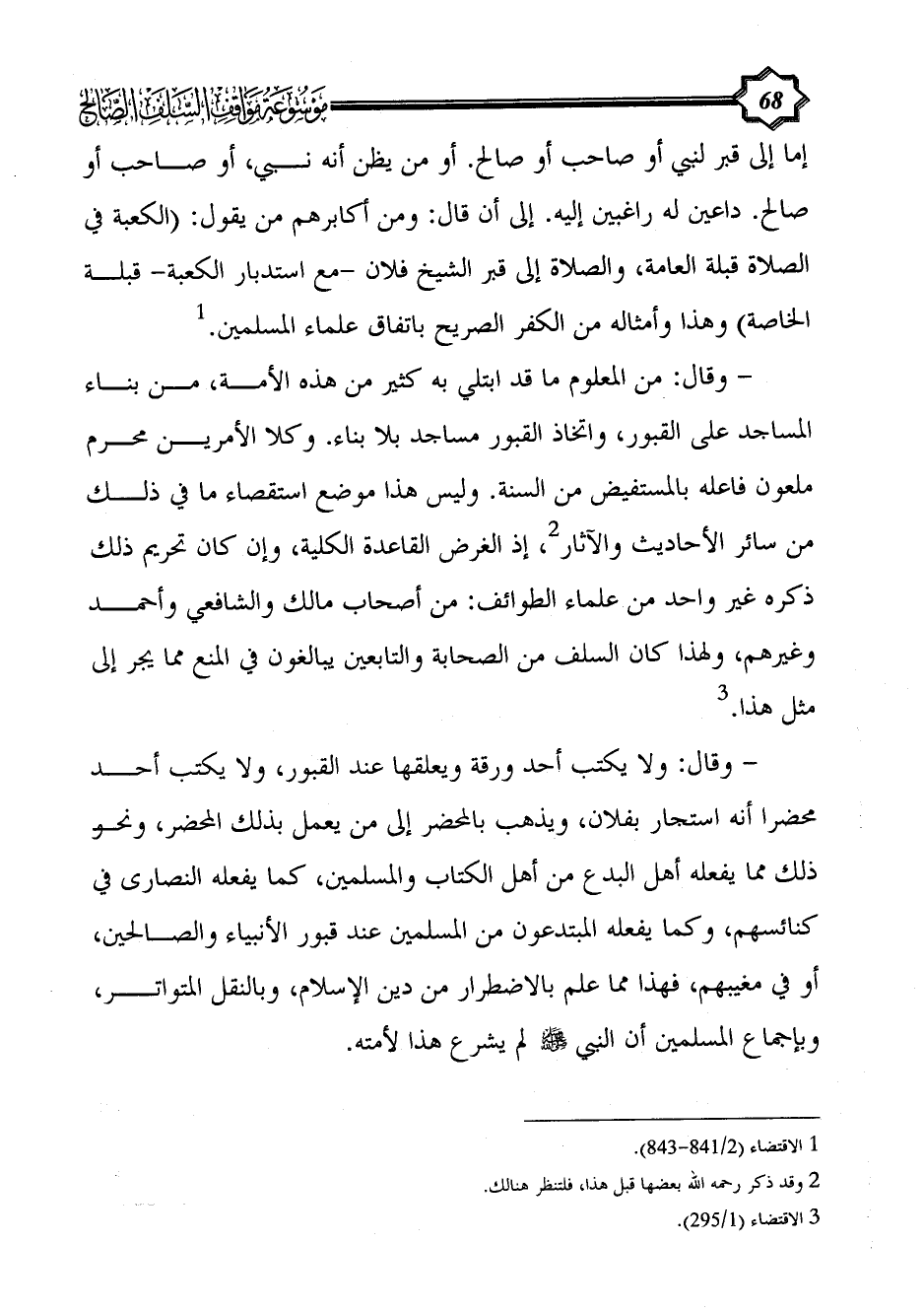 - وقال: ولا يكتب أحد ورقة ويعلقها عند القبور، ولا يكتب أحد محضرا أنه استجار بفلان، ويذهب بالمحضر إلى من يعمل بذلك المحضر، ونحو ذلك مما يفعله أهل البدع من أهل الكتاب والمسلمين، كما يفعله النصارى في كنائسهم، وكما يفعله المبتدعون من المسلمين عند قبور الأنبياء والصالحين، أو في مغيبهم، فهذا مما علم بالاضطرار من دين الإسلام، وبالنقل المتواتر، وبإجماع المسلمين أن النبي - صلى الله عليه وسلم - لم يشرع هذا لأمته.