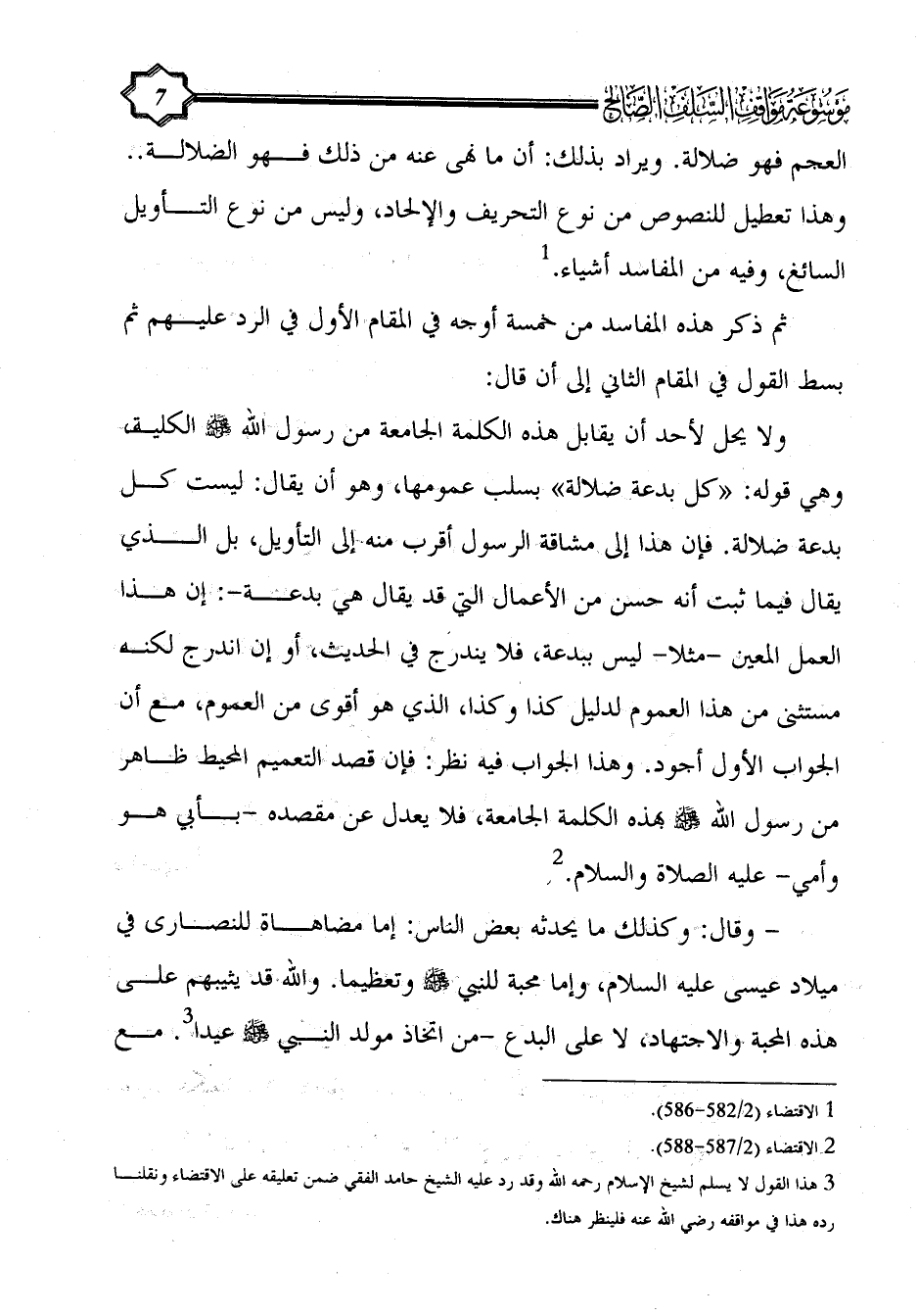 (¬3) هذا القول لا يسلم لشيخ الإسلام رحمه الله وقد رد عليه الشيخ حامد الفقي ضمن تعليقه على الاقتضاء ونقلنا رده هذا في مواقفه رضي الله عنه فلينظر هناك.