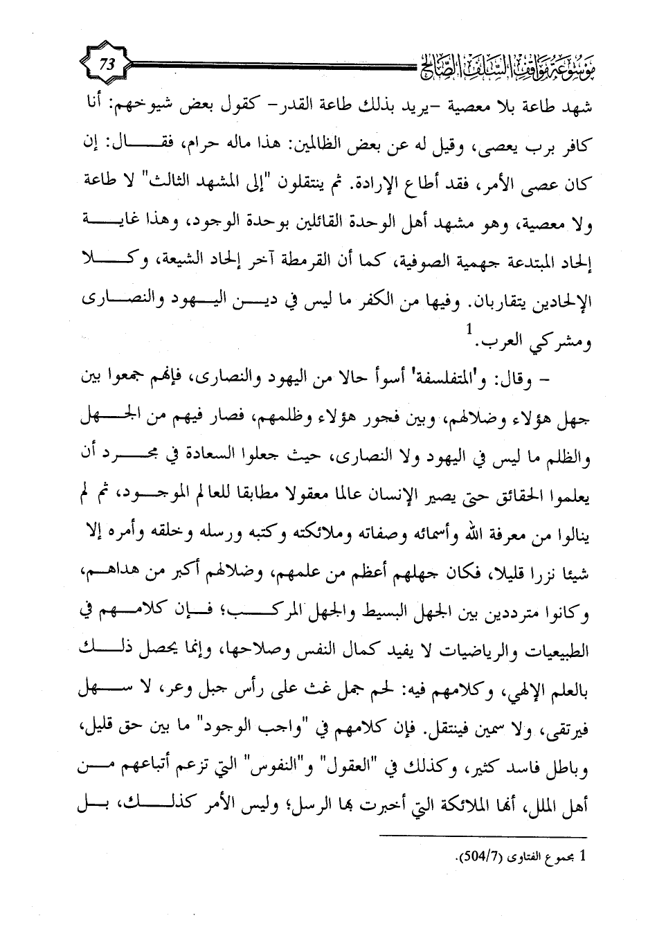شهد طاعة بلا معصية -يريد بذلك طاعة القدر- كقول بعض شيوخهم: أنا كافر برب يعصى، وقيل له عن بعض الظالمين: هذا ماله حرام، فقال: إن كان عصى الأمر، فقد أطاع الإرادة. ثم ينتقلون "إلى المشهد الثالث" لا طاعة ولا معصية، وهو مشهد أهل الوحدة القائلين بوحدة الوجود، وهذا غاية إلحاد المبتدعة جهمية الصوفية، كما أن القرمطة آخر إلحاد الشيعة، وكلا الإلحادين يتقاربان. وفيها من الكفر ما ليس في دين اليهود والنصارى ومشركي العرب. (¬1)
