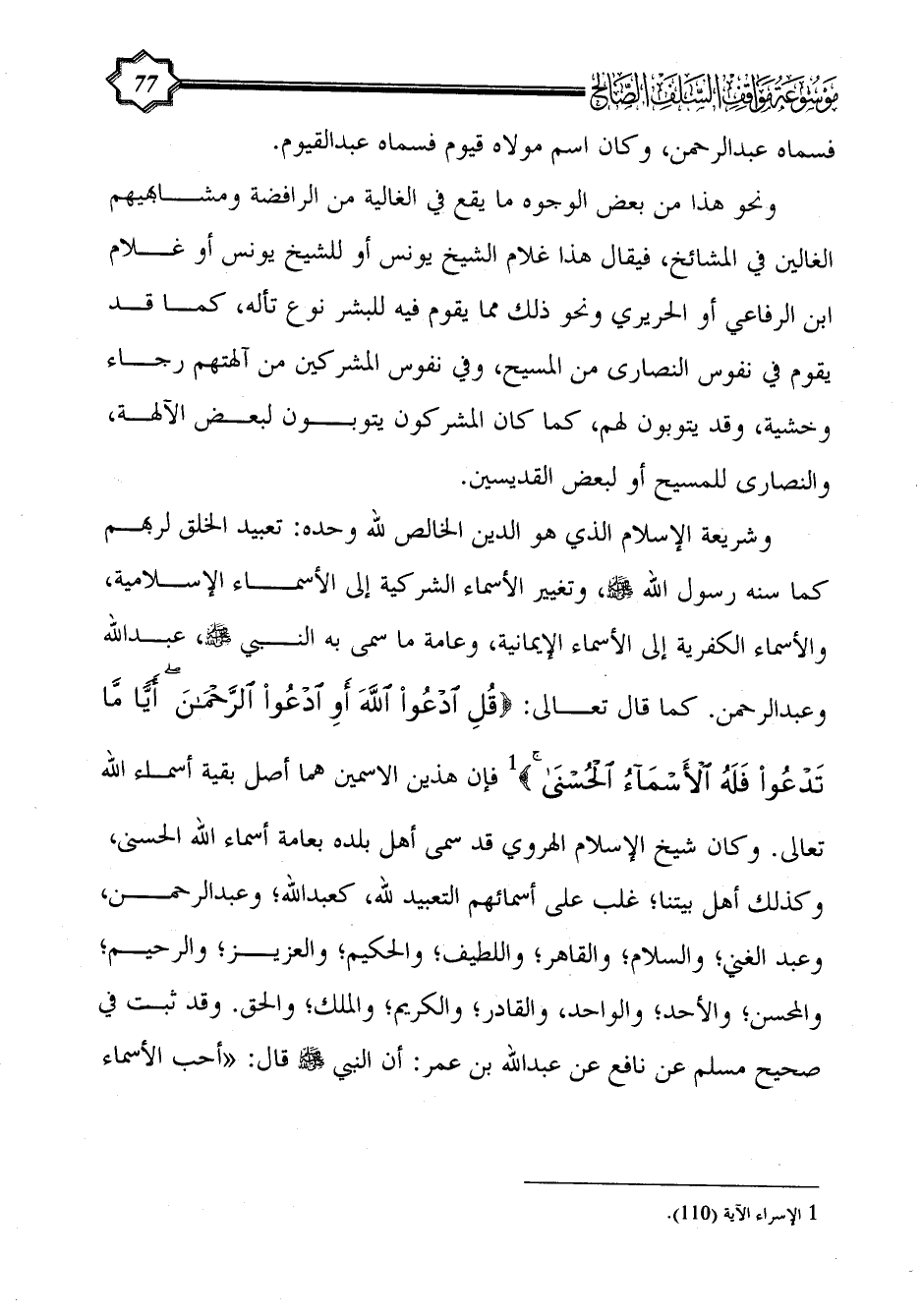 وشريعة الإسلام الذي هو الدين الخالص لله وحده: تعبيد الخلق لربهم كما سنه رسول الله - صلى الله عليه وسلم -، وتغيير الأسماء الشركية إلى الأسماء الإسلامية، والأسماء الكفرية إلى الأسماء الإيمانية، وعامة ما سمى به النبي - صلى الله عليه وسلم -، عبد الله وعبد الرحمن. كما قال تعالى: {قُلِ ادْعُوا اللَّهَ أَوِ ادْعُوا الرَّحْمَنَ أَيًّا مَا تَدْعُوا فَلَهُ الْأَسْمَاءُ الْحُسْنَى} (¬1) فإن هذين الاسمين هما أصل بقية أسماء الله تعالى. وكان شيخ الإسلام الهروي قد سمى أهل بلده بعامة أسماء الله الحسنى، وكذلك أهل بيتنا؛ غلب على أسمائهم التعبيد لله، كعبد الله؛ وعبد الرحمن، وعبد الغني؛ والسلام؛ والقاهر؛ واللطيف؛ والحكيم؛ والعزيز؛ والرحيم؛ والمحسن؛ والأحد؛ والواحد، والقادر؛ والكريم؛ والملك؛ والحق. وقد ثبت في صحيح مسلم عن نافع عن عبد الله بن عمر: أن النبي - صلى الله عليه وسلم - قال: «أحب الأسماء