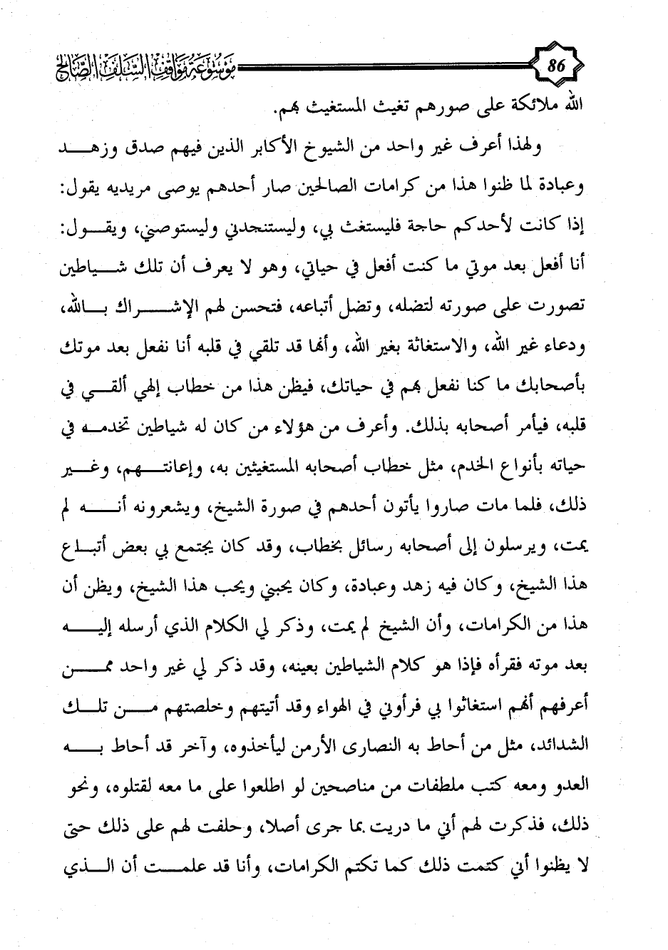 ولهذا أعرف غير واحد من الشيوخ الأكابر الذين فيهم صدق وزهد وعبادة لما ظنوا هذا من كرامات الصالحين صار أحدهم يوصى مريديه يقول: إذا كانت لأحدكم حاجة فليستغث بي، وليستنجدني وليستوصني، ويقول: أنا أفعل بعد موتي ما كنت أفعل في حياتي، وهو لا يعرف أن تلك شياطين تصورت على صورته لتضله، وتضل أتباعه، فتحسن لهم الإشراك بالله، ودعاء غير الله، والاستغاثة بغير الله، وأنها قد تلقي في قلبه أنا نفعل بعد موتك بأصحابك ما كنا نفعل بهم في حياتك، فيظن هذا من خطاب إلهي ألقي في قلبه، فيأمر أصحابه بذلك. وأعرف من هؤلاء من كان له شياطين تخدمه في حياته بأنواع الخدم، مثل خطاب أصحابه المستغيثين به، وإعانتهم، وغير ذلك، فلما مات صاروا يأتون أحدهم في صورة الشيخ، ويشعرونه أنه لم يمت، ويرسلون إلى أصحابه رسائل بخطاب، وقد كان يجتمع بي بعض أتباع هذا الشيخ، وكان فيه زهد وعبادة، وكان يحبني ويحب هذا الشيخ، ويظن أن هذا من الكرامات، وأن الشيخ لم يمت، وذكر لي الكلام الذي أرسله إليه بعد موته فقرأه فإذا هو كلام الشياطين بعينه، وقد ذكر لي غير واحد ممن أعرفهم أنهم استغاثوا بي فرأوني في الهواء وقد أتيتهم وخلصتهم من تلك الشدائد، مثل من أحاط به النصارى الأرمن ليأخذوه، وآخر قد أحاط به العدو ومعه كتب ملطفات من مناصحين لو اطلعوا على ما معه لقتلوه، ونحو ذلك، فذكرت لهم أني ما دريت بما جرى أصلا، وحلفت لهم على ذلك حتى لا يظنوا أني كتمت ذلك كما تكتم الكرامات، وأنا قد علمت أن الذي