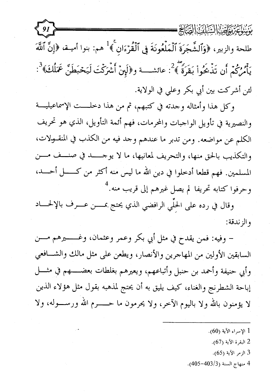 - وفيه: فمن يقدح في مثل أبي بكر وعمر وعثمان، وغيرهم من السابقين الأولين من المهاجرين والأنصار، ويطعن على مثل مالك والشافعي وأبي حنيفة وأحمد بن حنبل وأتباعهم، ويعيرهم بغلطات بعضهم في مثل إباحة الشطرنج والغناء، كيف يليق به أن يحتج لمذهبه بقول مثل هؤلاء الذين لا يؤمنون بالله ولا باليوم الآخر، ولا يحرمون ما حرم الله ورسوله، ولا