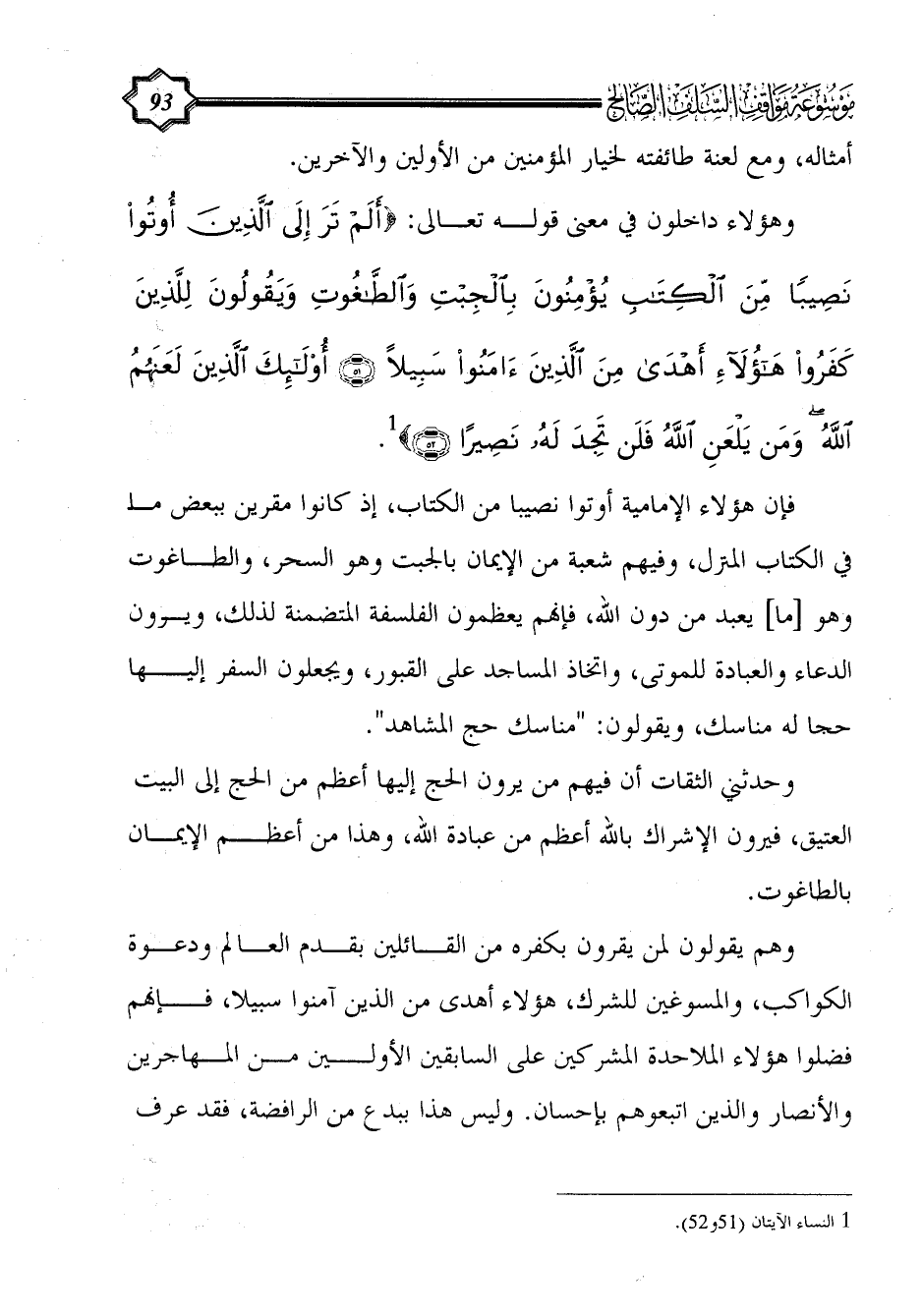 فإن هؤلاء الإمامية أوتوا نصيبا من الكتاب، إذ كانوا مقرين ببعض ما في الكتاب المنزل، وفيهم شعبة من الإيمان بالجبت وهو السحر، والطاغوت وهو [ما] يعبد من دون الله، فإنهم يعظمون الفلسفة المتضمنة لذلك، ويرون الدعاء والعبادة للموتى، واتخاذ المساجد على القبور، ويجعلون السفر إليها حجا له مناسك، ويقولون: "مناسك حج المشاهد".