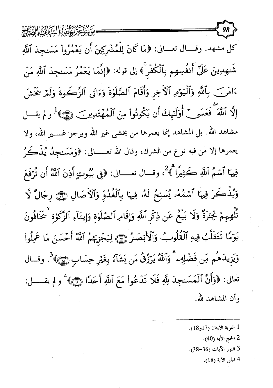 وقال تعالى: {فِي بُيُوتٍ أَذِنَ اللَّهُ أَنْ تُرْفَعَ وَيُذْكَرَ فِيهَا اسْمُهُ يُسَبِّحُ لَهُ فِيهَا بِالْغُدُوِّ وَالْآَصَالِ (36) رِجَالٌ لَا تُلْهِيهِمْ تِجَارَةٌ وَلَا بَيْعٌ عَنْ ذِكْرِ اللَّهِ وَإِقَامِ الصَّلَاةِ وَإِيتَاءِ الزَّكَاةِ يَخَافُونَ يَوْمًا تَتَقَلَّبُ فِيهِ الْقُلُوبُ وَالْأَبْصَارُ (37) لِيَجْزِيَهُمُ اللَّهُ أَحْسَنَ مَا عَمِلُوا وَيَزِيدَهُمْ مِنْ فَضْلِهِ وَاللَّهُ يَرْزُقُ مَنْ يَشَاءُ بِغَيْرِ حِسَابٍ (38)} (¬3). وقال تعالى: {وَأَنَّ الْمَسَاجِدَ لِلَّهِ فَلَا تَدْعُوا مَعَ اللَّهِ أَحَدًا (18)} (¬4) ولم يقل: وأن المشاهد لله.