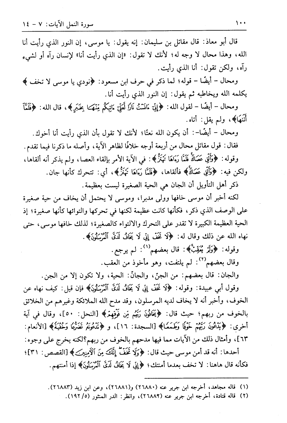 وقول أبي عبيدة: وقوله: (لَا تَخَفْ إِنِّي لَا يَخَافُ لَدَيَّ الْمُرْسَلُونَ) فَإِنْ قِيلَ: كيف نهاه عن الخوف، وأخبر أنه لا يخاف لديه المرسلون، وقد مدح اللَّه الملائكة وغيرهم من الخلائق بالخوف من ربهم؛ حيث قال: (يَخَافُونَ رَبَّهُمْ مِنْ فَوْقِهِمْ)، وقال في آية أخري: (يَدْعُونَ رَبَّهُمْ خَوْفًا وَطَمَعًا)، و (تَدْعُونَهُ تَضَرُّعًا وَخُفْيَةً)، وأمثال ذلك من الآيات مما فيها مدحهم بالخوف من ربهم؛ لكنه يخرج على وجوه: أحدها: أنه قد أمن موسى حيث قال: (وَلَا تَخَفْ إِنَّكَ مِنَ الْآمِنِينَ)؛ فكأنه قال هاهنا: لا تخف بعدما أمنتك؛ (إِنِّي لَا يَخَافُ لَدَيَّ الْمُرْسَلُونَ) إذا أمنتهم.