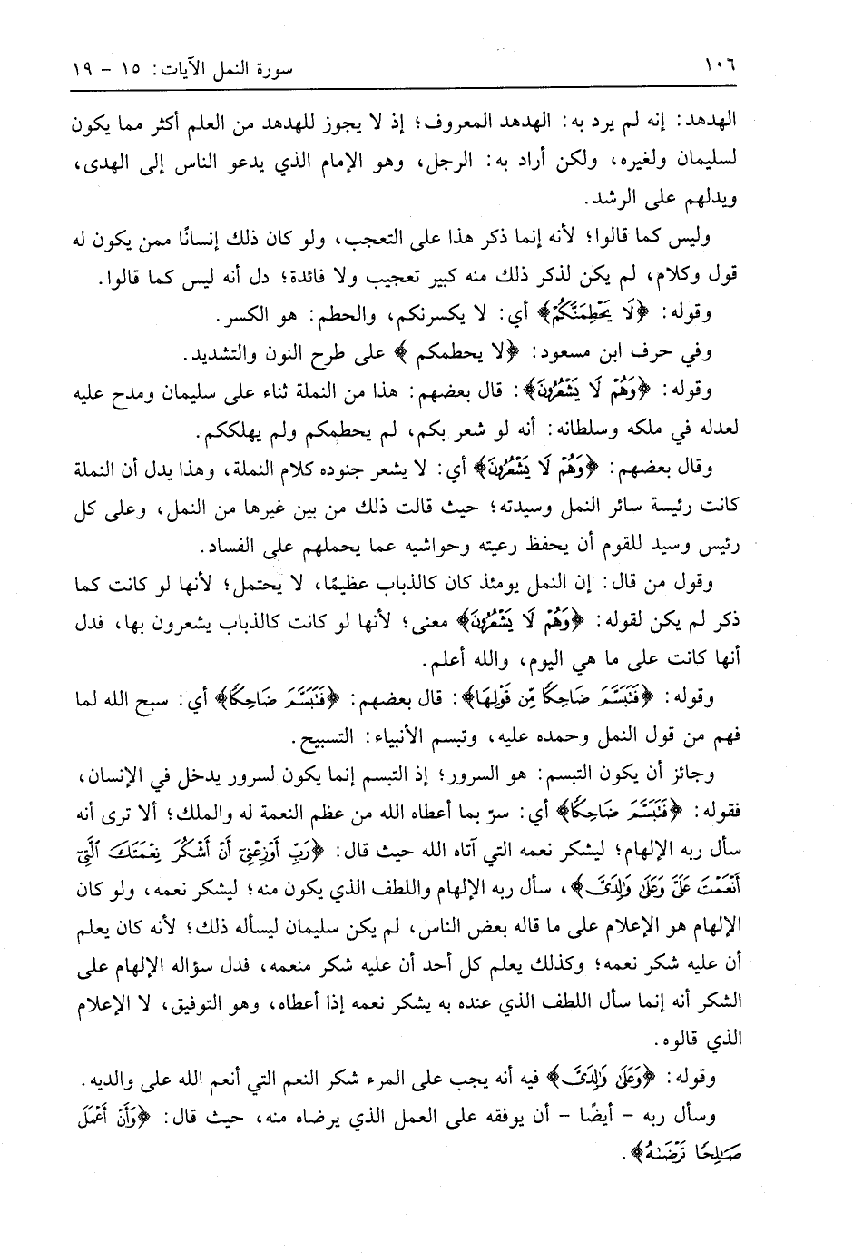 وقوله: (فَتَبَسَّمَ ضَاحِكًا مِنْ قَوْلِهَا وَقَالَ رَبِّ أَوْزِعْنِي أَنْ أَشْكُرَ نِعْمَتَكَ الَّتِي أَنْعَمْتَ عَلَيَّ وَعَلَى وَالِدَيَّ وَأَنْ أَعْمَلَ صَالِحًا تَرْضَاهُ وَأَدْخِلْنِي بِرَحْمَتِكَ فِي عِبَادِكَ الصَّالِحِينَ (19) قَالَ بَعْضُهُمْ: (فَتَبَسَّمَ ضَاحِكًا) أي: سبح اللَّه لما فهم من قول النمل وحمده عليه، وتبسم الأنبياء: التسبيح.