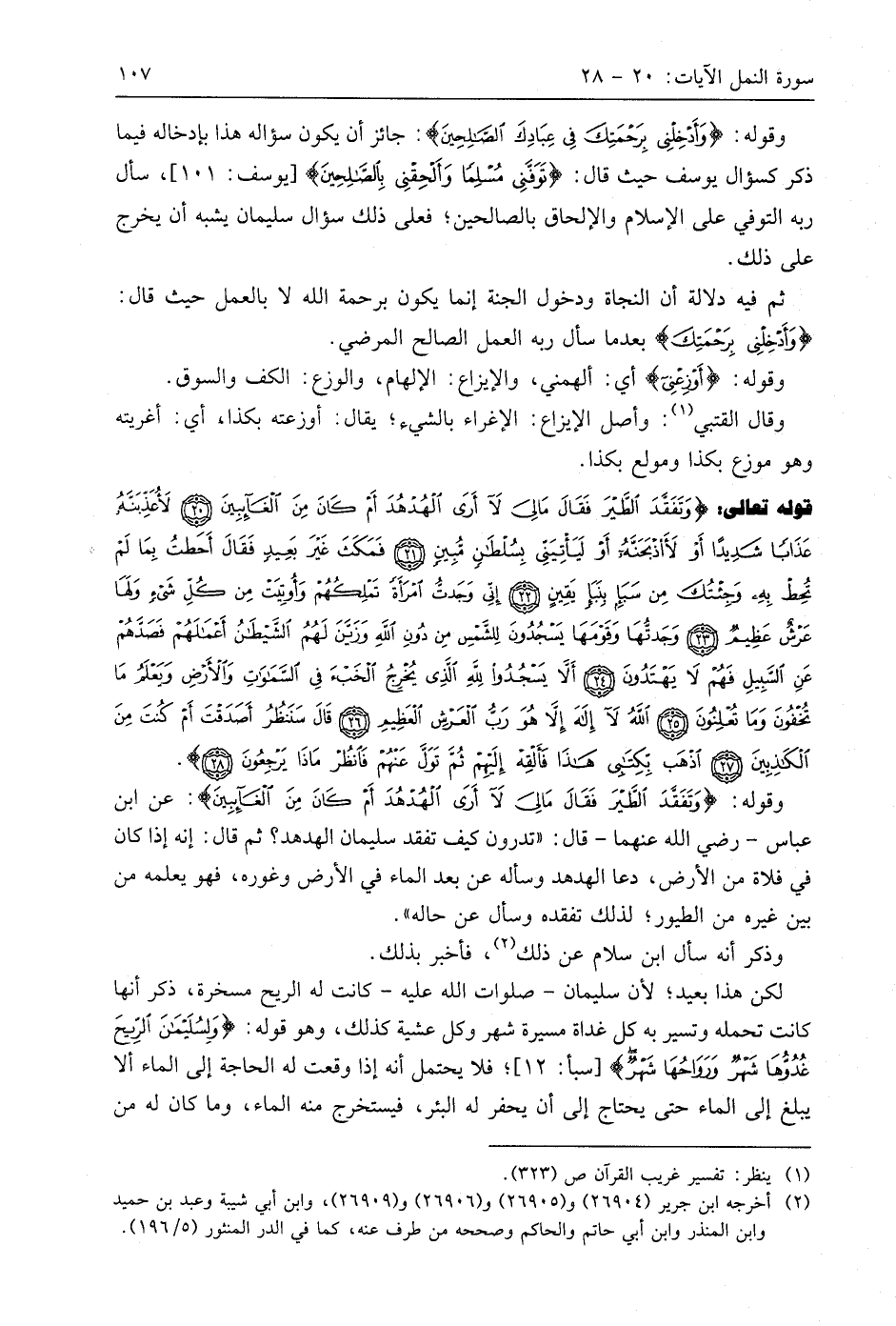 وقوله: (وَتَفَقَّدَ الطَّيْرَ فَقَالَ مَا لِيَ لَا أَرَى الْهُدْهُدَ أَمْ كَانَ مِنَ الْغَائِبِينَ): عن ابن عباس - رضي اللَّه عنهما - قال: " تدرون كيف تفقد سليمان الهدهد؟ ثم قال: إنه إذا كان في فلاة من الأرض، دعا الهدهد وسأله عن بعد الماء في الأرض وغوره، فهو يعلمه من بين غيره من الطيور؛ لذلك تفقده وسأل عن حاله ".