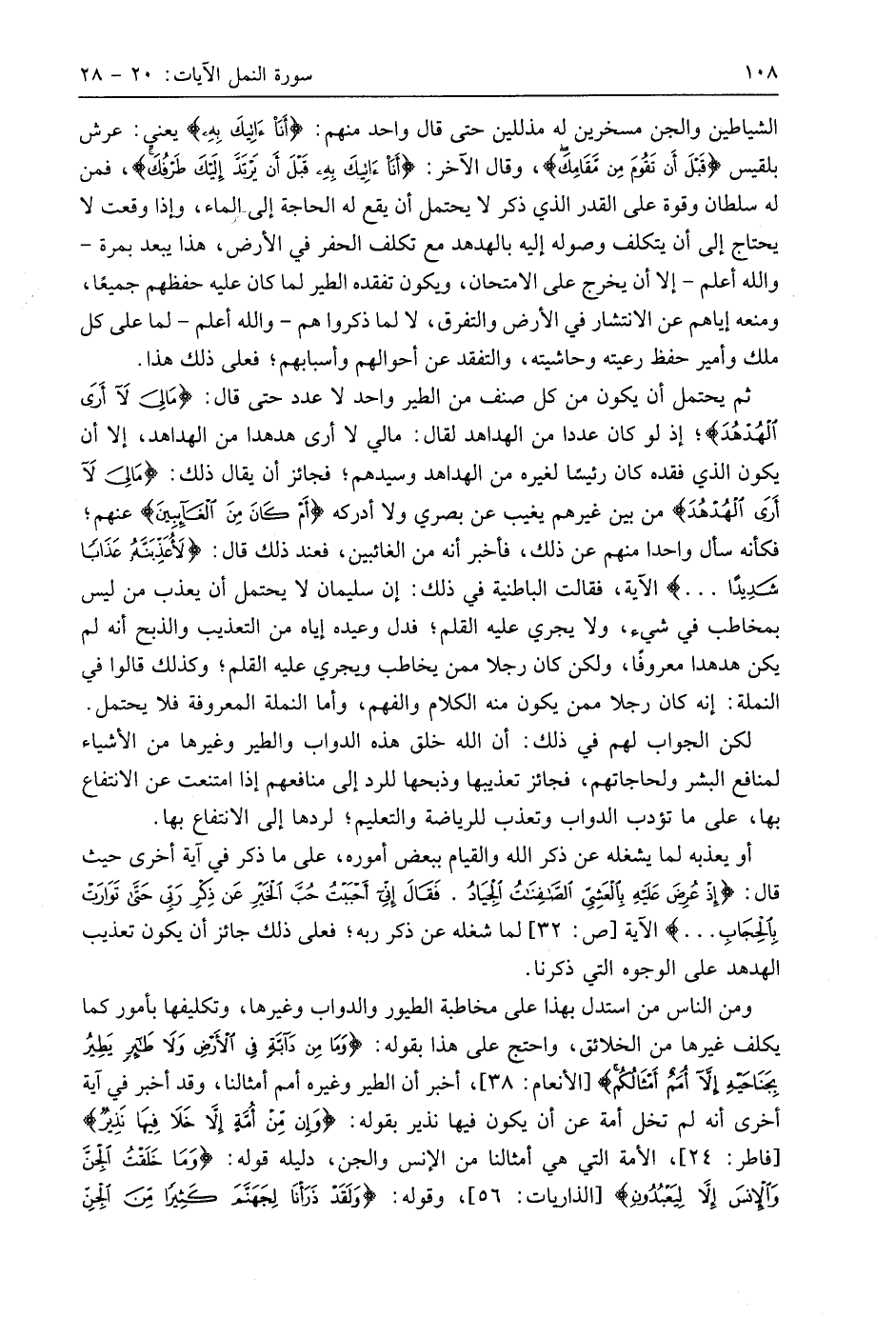 ثم يحتمل أن يكون من كل صنف من الطير واحد لا عدد حتى قال: (مَا لِيَ لَا أَرَى الْهُدْهُدَ)؛ إذ لو كان عددا من الهداهد لقال: مالي لا أرى هدهدا من الهداهد، إلا أن يكون الذي فقده كان رئيسًا لغيره من الهداهد وسيدهم؛ فجائز أن يقال ذلك: (مَا لِيَ لَا أَرَى الْهُدْهُدَ) من بين غيرهم يغيب عن بصري ولا أدركه (أَمْ كَانَ مِنَ الْغَائِبِينَ) عنهم؛ فكأنه سأل واحدا منهم عن ذلك، فأخبر أنه من الغائبين، فعند ذلك قال: (لَأُعَذِّبَنَّهُ عَذَابًا شَدِيدًا أَوْ لَأَذْبَحَنَّهُ أَوْ لَيَأْتِيَنِّي بِسُلْطَانٍ مُبِينٍ (21) فقالت الباطنية في ذلك: إن سليمان لا يحتمل أن يعذب من ليس بمخاطب في شيء، ولا يجري عليه القلم؛ فدل وعيده إياه من التعذيب والذبح أنه لم يكن هدهدا معروفًا، ولكن كان رجلا ممن يخاطب ويجري عليه القلم؛ وكذلك قالوا في النملة: إنه كان رجلا ممن يكون منه الكلام والفهم، وأما النملة المعروفة فلا يحتمل.