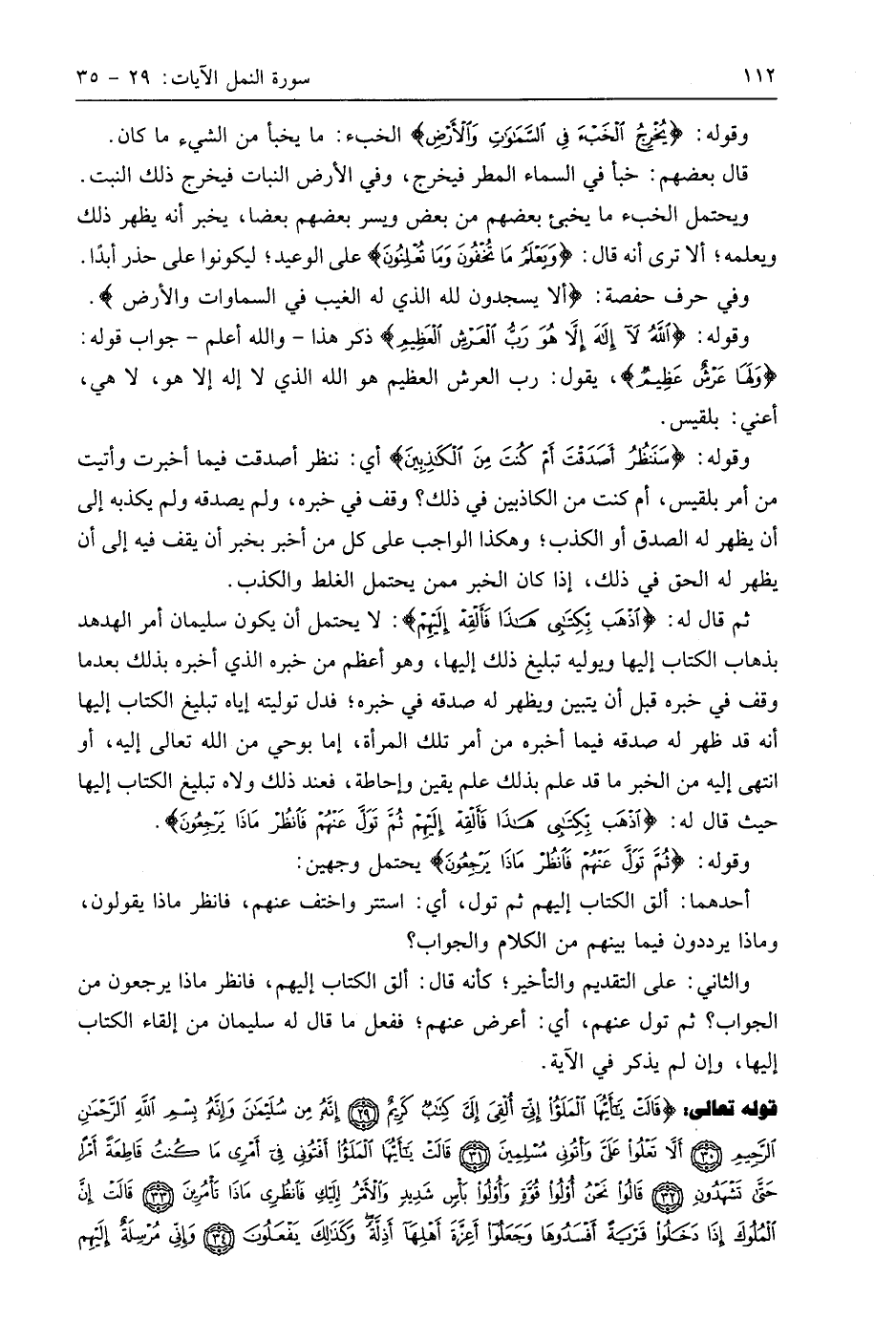 قوله تعالى: (قَالَتْ يَا أَيُّهَا الْمَلَأُ إِنِّي أُلْقِيَ إِلَيَّ كِتَابٌ كَرِيمٌ (29) إِنَّهُ مِنْ سُلَيْمَانَ وَإِنَّهُ بِسْمِ اللَّهِ الرَّحْمَنِ الرَّحِيمِ (30) أَلَّا تَعْلُوا عَلَيَّ وَأْتُونِي مُسْلِمِينَ (31) قَالَتْ يَا أَيُّهَا الْمَلَأُ أَفْتُونِي فِي أَمْرِي مَا كُنْتُ قَاطِعَةً أَمْرًا حَتَّى تَشْهَدُونِ (32) قَالُوا نَحْنُ أُولُو قُوَّةٍ وَأُولُو بَأْسٍ شَدِيدٍ وَالْأَمْرُ إِلَيْكِ فَانْظُرِي مَاذَا تَأْمُرِينَ (33) قَالَتْ إِنَّ الْمُلُوكَ إِذَا دَخَلُوا قَرْيَةً أَفْسَدُوهَا وَجَعَلُوا أَعِزَّةَ أَهْلِهَا أَذِلَّةً وَكَذَلِكَ يَفْعَلُونَ (34) وَإِنِّي مُرْسِلَةٌ إِلَيْهِمْ
