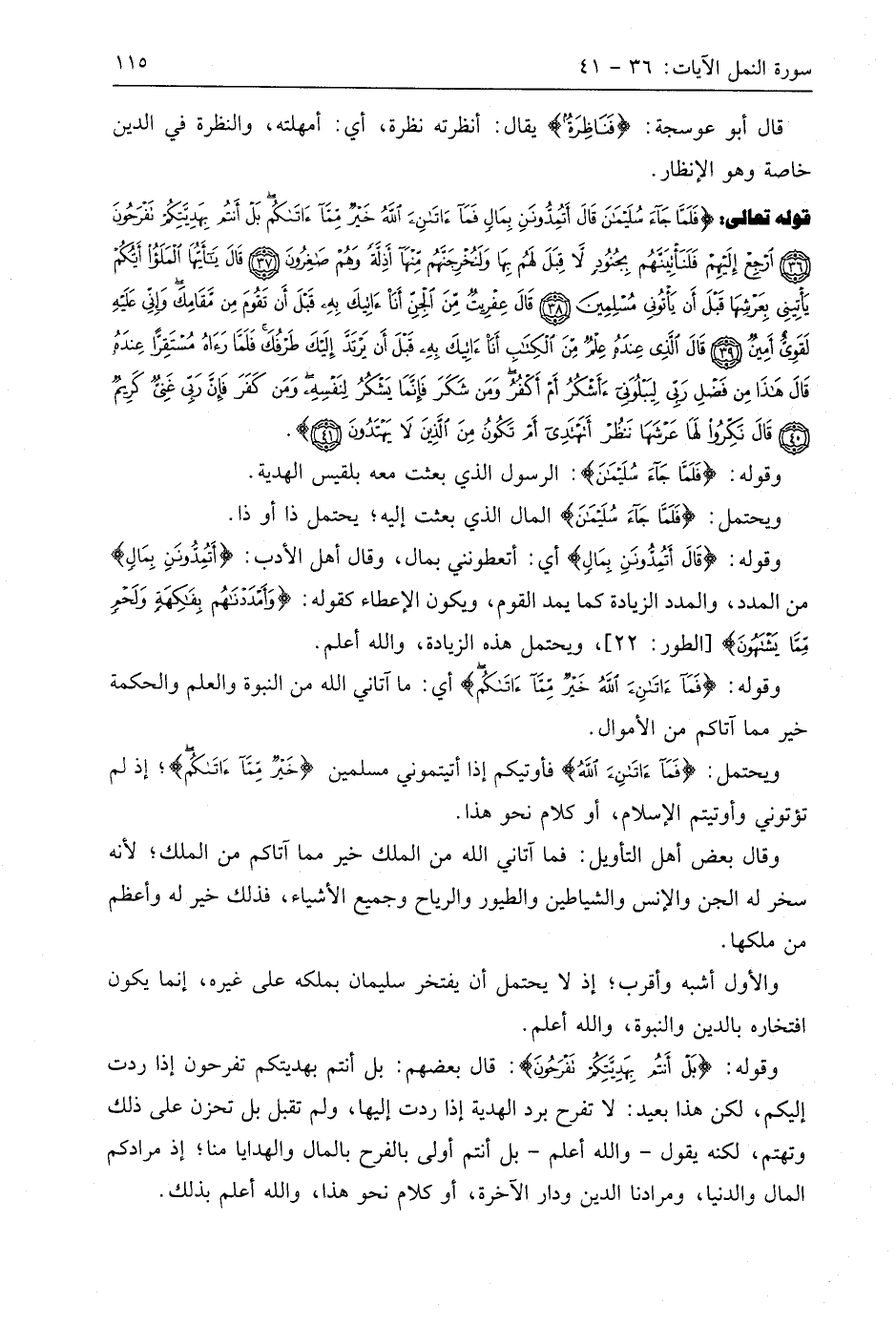 قوله تعالى: (فَلَمَّا جَاءَ سُلَيْمَانَ قَالَ أَتُمِدُّونَنِ بِمَالٍ فَمَا آتَانِيَ اللَّهُ خَيْرٌ مِمَّا آتَاكُمْ بَلْ أَنْتُمْ بِهَدِيَّتِكُمْ تَفْرَحُونَ (36) ارْجِعْ إِلَيْهِمْ فَلَنَأْتِيَنَّهُمْ بِجُنُودٍ لَا قِبَلَ لَهُمْ بِهَا وَلَنُخْرِجَنَّهُمْ مِنْهَا أَذِلَّةً وَهُمْ صَاغِرُونَ (37) قَالَ يَا أَيُّهَا الْمَلَأُ أَيُّكُمْ يَأْتِينِي بِعَرْشِهَا قَبْلَ أَنْ يَأْتُونِي مُسْلِمِينَ (38) قَالَ عِفْرِيتٌ مِنَ الْجِنِّ أَنَا آتِيكَ بِهِ قَبْلَ أَنْ تَقُومَ مِنْ مَقَامِكَ وَإِنِّي عَلَيْهِ لَقَوِيٌّ أَمِينٌ (39) قَالَ الَّذِي عِنْدَهُ عِلْمٌ مِنَ الْكِتَابِ أَنَا آتِيكَ بِهِ قَبْلَ أَنْ يَرْتَدَّ إِلَيْكَ طَرْفُكَ فَلَمَّا رَآهُ مُسْتَقِرًّا عِنْدَهُ قَالَ هَذَا مِنْ فَضْلِ رَبِّي لِيَبْلُوَنِي أَأَشْكُرُ أَمْ أَكْفُرُ وَمَنْ شَكَرَ فَإِنَّمَا يَشْكُرُ لِنَفْسِهِ وَمَنْ كَفَرَ فَإِنَّ رَبِّي غَنِيٌّ كَرِيمٌ (40) قَالَ نَكِّرُوا لَهَا عَرْشَهَا نَنْظُرْ أَتَهْتَدِي أَمْ تَكُونُ مِنَ الَّذِينَ لَا يَهْتَدُونَ (41)