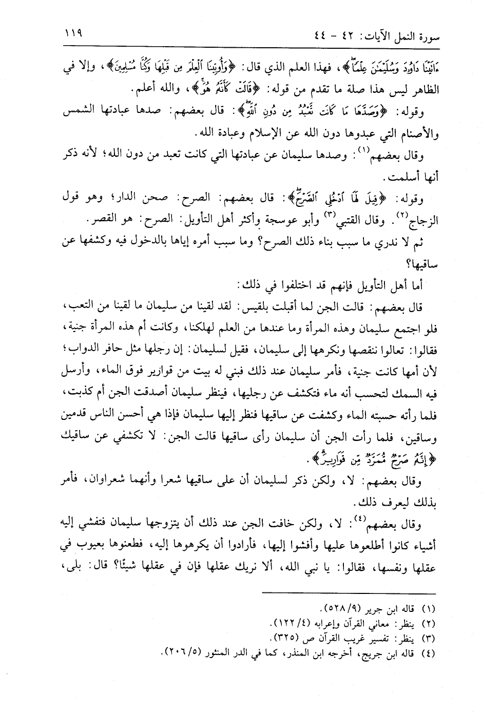 وقوله: (قِيلَ لَهَا ادْخُلِي الصَّرْحَ فَلَمَّا رَأَتْهُ حَسِبَتْهُ لُجَّةً وَكَشَفَتْ عَنْ سَاقَيْهَا قَالَ إِنَّهُ صَرْحٌ مُمَرَّدٌ مِنْ قَوَارِيرَ قَالَتْ رَبِّ إِنِّي ظَلَمْتُ نَفْسِي وَأَسْلَمْتُ مَعَ سُلَيْمَانَ لِلَّهِ رَبِّ الْعَالَمِينَ (44) قَالَ بَعْضُهُمْ: الصرح: صحن الدار؛ وهو قول الزجاج. وقَالَ الْقُتَبِيُّ وأَبُو عَوْسَجَةَ وأكثر أهل التأويل: الصرح: هو القصر.