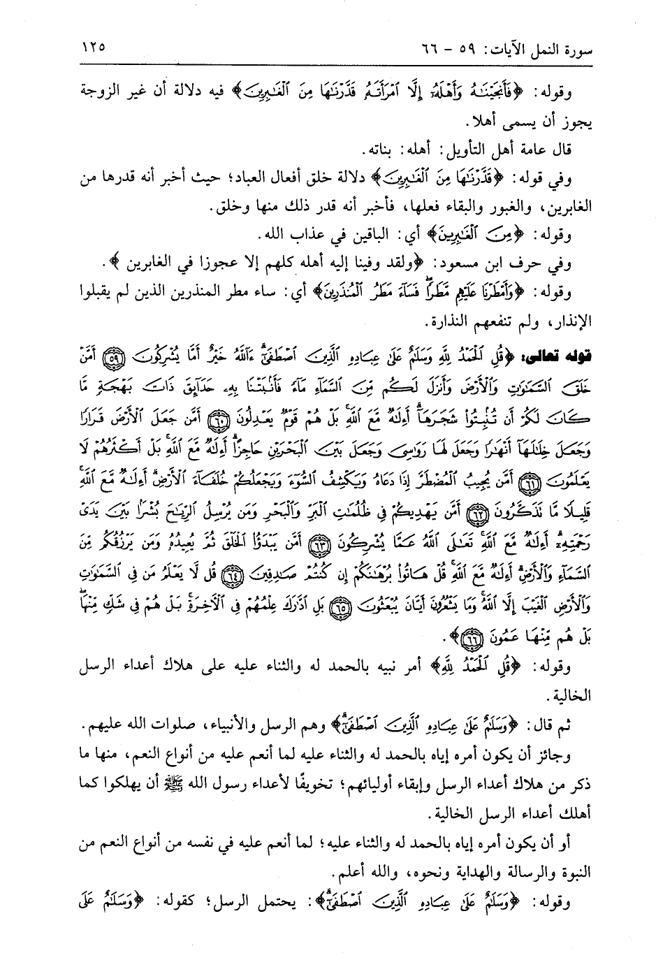 قوله تعالى: (قُلِ الْحَمْدُ لِلَّهِ وَسَلَامٌ عَلَى عِبَادِهِ الَّذِينَ اصْطَفَى آللَّهُ خَيْرٌ أَمَّا يُشْرِكُونَ (59) أَمَّنْ خَلَقَ السَّمَاوَاتِ وَالْأَرْضَ وَأَنْزَلَ لَكُمْ مِنَ السَّمَاءِ مَاءً فَأَنْبَتْنَا بِهِ حَدَائِقَ ذَاتَ بَهْجَةٍ مَا كَانَ لَكُمْ أَنْ تُنْبِتُوا شَجَرَهَا أَإِلَهٌ مَعَ اللَّهِ بَلْ هُمْ قَوْمٌ يَعْدِلُونَ (60) أَمَّنْ جَعَلَ الْأَرْضَ قَرَارًا وَجَعَلَ خِلَالَهَا أَنْهَارًا وَجَعَلَ لَهَا رَوَاسِيَ وَجَعَلَ بَيْنَ الْبَحْرَيْنِ حَاجِزًا أَإِلَهٌ مَعَ اللَّهِ بَلْ أَكْثَرُهُمْ لَا يَعْلَمُونَ (61) أَمَّنْ يُجِيبُ الْمُضْطَرَّ إِذَا دَعَاهُ وَيَكْشِفُ السُّوءَ وَيَجْعَلُكُمْ خُلَفَاءَ الْأَرْضِ أَإِلَهٌ مَعَ اللَّهِ قَلِيلًا مَا تَذَكَّرُونَ (62) أَمَّنْ يَهْدِيكُمْ فِي ظُلُمَاتِ الْبَرِّ وَالْبَحْرِ وَمَنْ يُرْسِلُ الرِّيَاحَ بُشْرًا بَيْنَ يَدَيْ رَحْمَتِهِ أَإِلَهٌ مَعَ اللَّهِ تَعَالَى اللَّهُ عَمَّا يُشْرِكُونَ (63) أَمَّنْ يَبْدَأُ الْخَلْقَ ثُمَّ يُعِيدُهُ وَمَنْ يَرْزُقُكُمْ مِنَ السَّمَاءِ وَالْأَرْضِ أَإِلَهٌ مَعَ اللَّهِ قُلْ هَاتُوا بُرْهَانَكُمْ إِنْ كُنْتُمْ صَادِقِينَ (64) قُلْ لَا يَعْلَمُ مَنْ فِي السَّمَاوَاتِ وَالْأَرْضِ الْغَيْبَ إِلَّا اللَّهُ وَمَا يَشْعُرُونَ أَيَّانَ يُبْعَثُونَ (65) بَلِ ادَّارَكَ عِلْمُهُمْ فِي الْآخِرَةِ بَلْ هُمْ فِي شَكٍّ مِنْهَا بَلْ هُمْ مِنْهَا عَمُونَ (66)