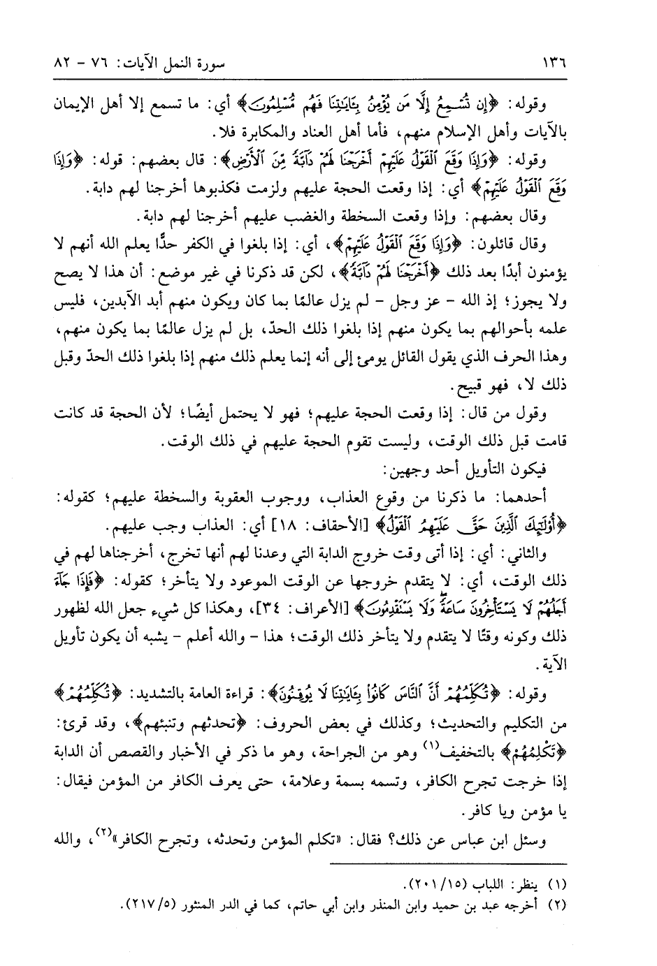وقوله: (وَإِذَا وَقَعَ الْقَوْلُ عَلَيْهِمْ أَخْرَجْنَا لَهُمْ دَابَّةً مِنَ الْأَرْضِ تُكَلِّمُهُمْ أَنَّ النَّاسَ كَانُوا بِآيَاتِنَا لَا يُوقِنُونَ (82) قَالَ بَعْضُهُمْ: قوله: (وَإِذَا وَقَعَ الْقَوْلُ عَلَيْهِمْ) أي: إذا وقعت الحجة عليهم ولزمت فكذبوها أخرجنا لهم دابة.