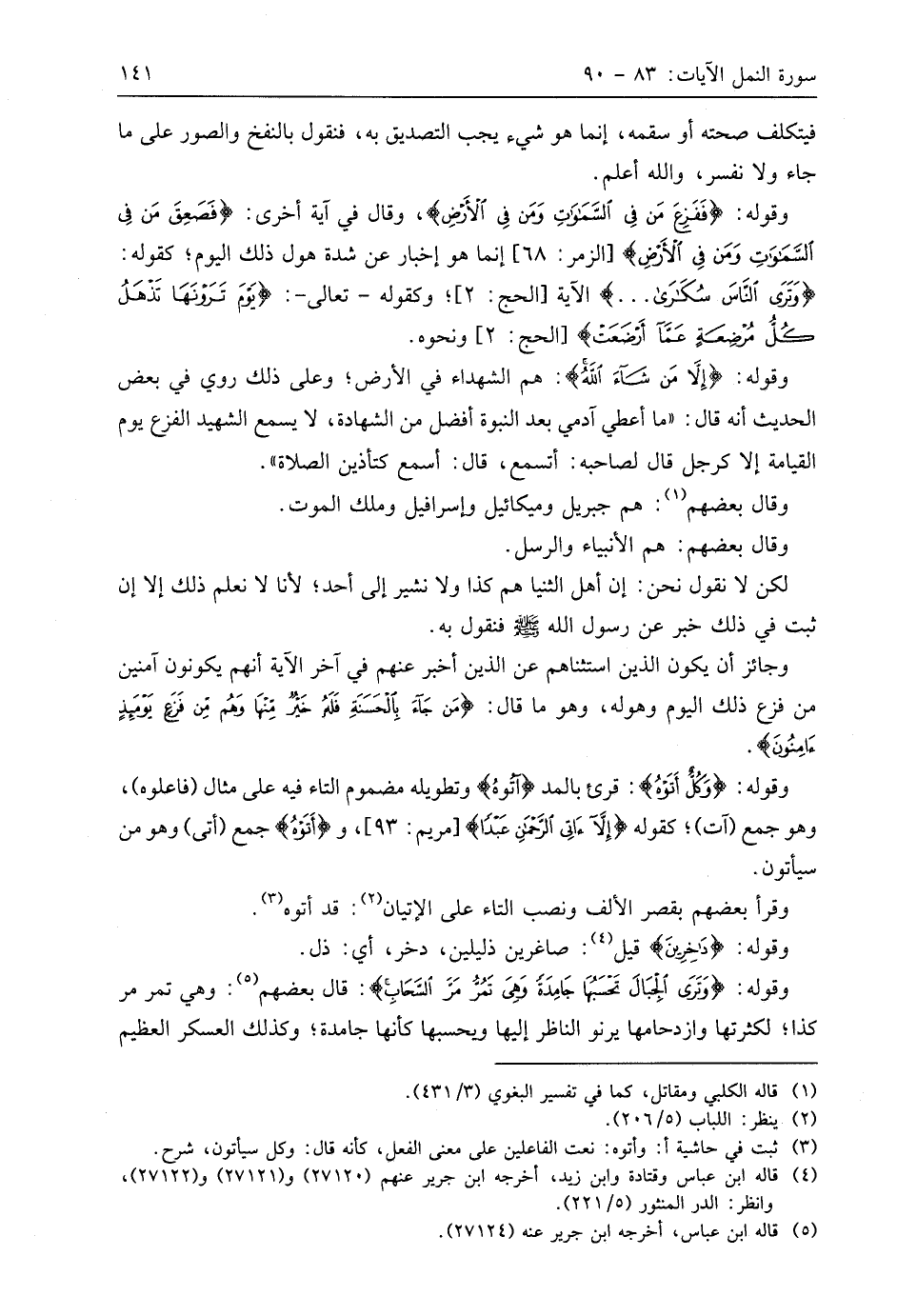وقوله: (فَفَزِعَ مَنْ فِي السَّمَاوَاتِ وَمَنْ فِي الْأَرْضِ)، وقال في آية أخرى: (فَصَعِقَ مَنْ فِي السَّمَاوَاتِ وَمَنْ فِي الْأَرْضِ) إنما هو إخبار عن شدة هول ذلك اليوم؛ كقوله: (وَتَرَى النَّاسَ سُكَارَى. . .) الآية؛ وكقوله - تعالى -: (يَوْمَ تَرَوْنَهَا تَذْهَلُ كُلُّ مُرْضِعَةٍ عَمَّا أَرْضَعَتْ)، ونحوه.