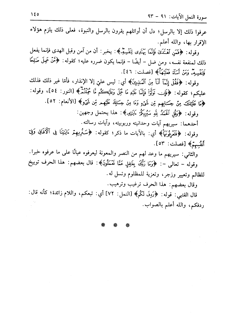 وقوله: (وَقُلِ الْحَمْدُ لِلَّهِ سَيُرِيكُمْ آيَاتِهِ فَتَعْرِفُونَهَا ... (93) هذا يحتمل وجهين: أحدهما: سرِيهم آيات وحدانيته وربوبيته، وآيات رسالته.