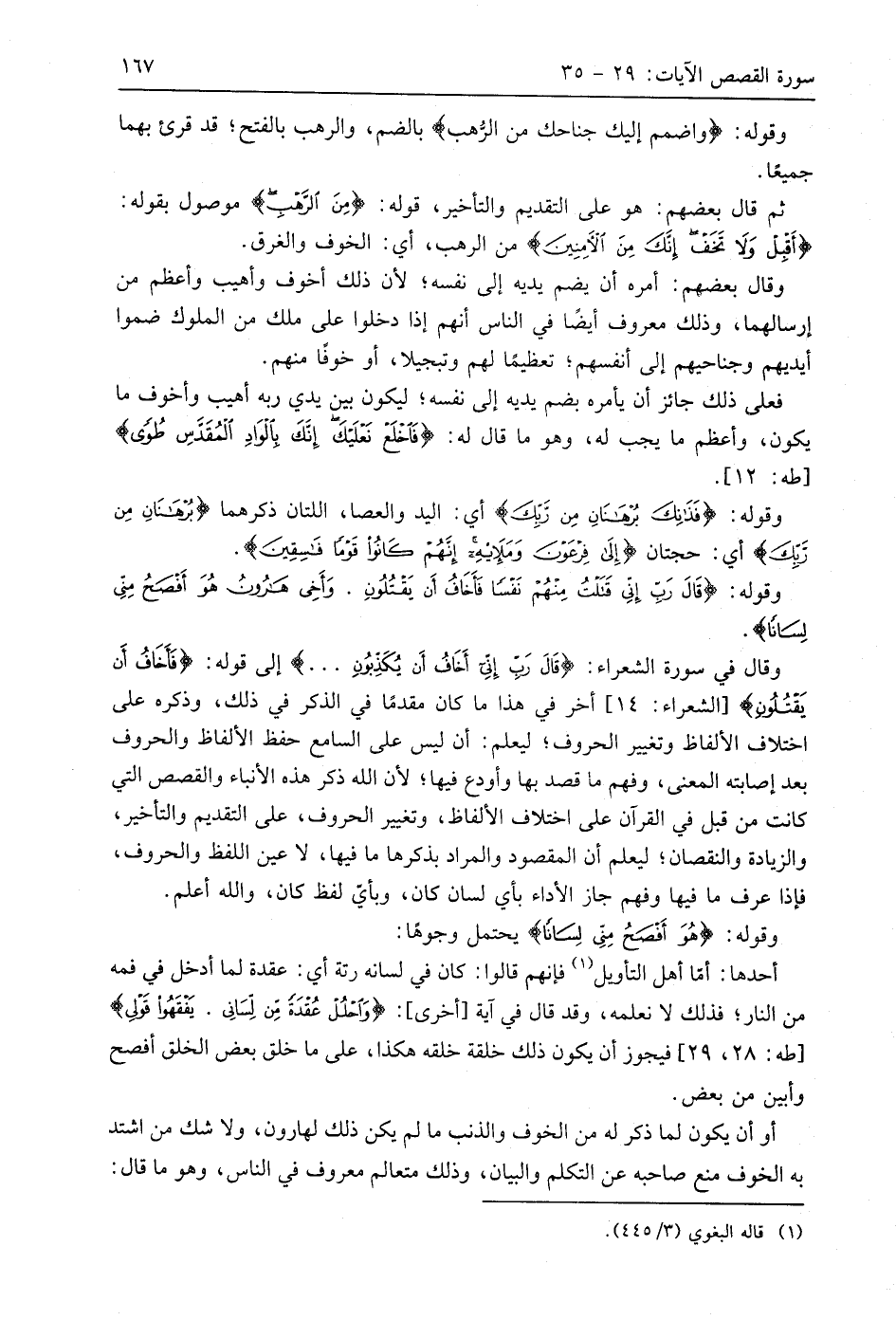وقوله: (قَالَ رَبِّ إِنِّي قَتَلْتُ مِنْهُمْ نَفْسًا فَأَخَافُ أَنْ يَقْتُلُونِ (33) وَأَخِي هَارُونُ هُوَ أَفْصَحُ مِنِّي لِسَانًا) وقال في سورة الشعراء: (قَالَ رَبِّ إِنِّي أَخَافُ أَنْ يُكَذِّبُونِ. . .) إلى قوله: (فَأَخَافُ أَنْ يَقْتُلُونِ)، أخر في هذا ما كان مقدمًا في الذكر في ذلك، وذكره على اختلاف الألفاظ وتغيير الحروف؛ ليعلم: أن ليس على السامع حفظ الألفاظ والحروف بعد إصابته المعنى، وفهم ما قصد بها وأودع فيها؛ لأن اللَّه ذكر هذه الأنباء والقصص التي كانت من قبل في القرآن على اختلاف الألفاظ، وتغيير الحروف، على التقديم والتأخير، والزيادة والنقصان؛ ليعلم أن المقصود والمراد بذكرها ما فيها، لا عين اللفظ والحروف، فإذا عرف ما فيها وفهم جاز الأداء بأي لسان كان، وبأي لفظ كان، واللَّه أعلم.