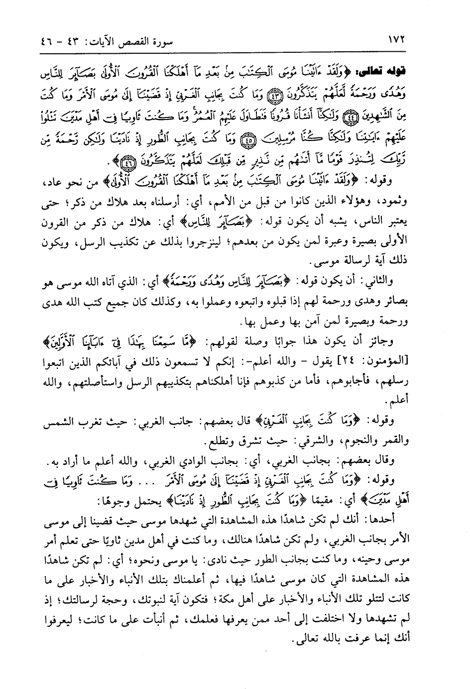 قوله تعالى: (وَلَقَدْ آتَيْنَا مُوسَى الْكِتَابَ مِنْ بَعْدِ مَا أَهْلَكْنَا الْقُرُونَ الْأُولَى بَصَائِرَ لِلنَّاسِ وَهُدًى وَرَحْمَةً لَعَلَّهُمْ يَتَذَكَّرُونَ (43) وَمَا كُنْتَ بِجَانِبِ الْغَرْبِيِّ إِذْ قَضَيْنَا إِلَى مُوسَى الْأَمْرَ وَمَا كُنْتَ مِنَ الشَّاهِدِينَ (44) وَلَكِنَّا أَنْشَأْنَا قُرُونًا فَتَطَاوَلَ عَلَيْهِمُ الْعُمُرُ وَمَا كُنْتَ ثَاوِيًا فِي أَهْلِ مَدْيَنَ تَتْلُو عَلَيْهِمْ آيَاتِنَا وَلَكِنَّا كُنَّا مُرْسِلِينَ (45) وَمَا كُنْتَ بِجَانِبِ الطُّورِ إِذْ نَادَيْنَا وَلَكِنْ رَحْمَةً مِنْ رَبِّكَ لِتُنْذِرَ قَوْمًا مَا أَتَاهُمْ مِنْ نَذِيرٍ مِنْ قَبْلِكَ لَعَلَّهُمْ يَتَذَكَّرُونَ (46)