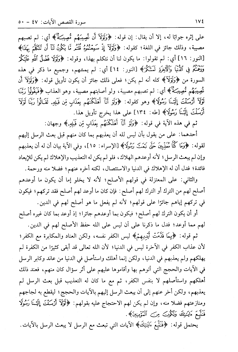 على إثره جوابًا له، إلا أن يقال: إن قوله: (وَلَوْلَا أَنْ تُصِيبَهُمْ مُصِيبَةٌ) أي: لم تصبهم مصيبة، وذلك جائز في اللغة؛ كقوله: (وَلَوْلَا إِذْ سَمِعْتُمُوهُ قُلْتُمْ مَا يَكُونُ لَنَا أَنْ نَتَكَلَّمَ بِهَذَا) أي: لم تقولوا: ما يكون لنا أن نتكلم بهذا، وقوله: (وَلَوْلَا فَضْلُ اللَّهِ عَلَيْكُمْ وَرَحْمَتُهُ فِي الدُّنْيَا وَالْآخِرَةِ لَمَسَّكُمْ)، أي: لم يمشهم، وجميع ما ذكر في هذه السورة من (وَلَوْلَا) كله أنه لم يكن؛ فعلى ذلك جائز أن يكون تأويل قوله: (وَلَوْلَا أَنْ تُصِيبَهُمْ مُصِيبَةٌ) أي: لم تصبهم مصيبة، ولو أصابتهم مصيبة، وهو العذاب (فَيَقُولُوا رَبَّنَا لَوْلَا أَرْسَلْتَ إِلَيْنَا رَسُولًا) وهو كقوله: (وَلَوْ أَنَّا أَهْلَكْنَاهُمْ بِعَذَابٍ مِنْ قَبْلِهِ لَقَالُوا رَبَّنَا لَوْلَا أَرْسَلْتَ إِلَيْنَا رَسُولًا)، على هذا يخرج تأويل هذا.