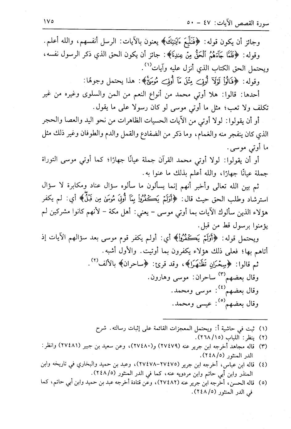 وقوله: (فَلَمَّا جَاءَهُمُ الْحَقُّ مِنْ عِنْدِنَا قَالُوا لَوْلَا أُوتِيَ مِثْلَ مَا أُوتِيَ مُوسَى أَوَلَمْ يَكْفُرُوا بِمَا أُوتِيَ مُوسَى مِنْ قَبْلُ قَالُوا سِحْرَانِ تَظَاهَرَا وَقَالُوا إِنَّا بِكُلٍّ كَافِرُونَ (48) جائز أن يكون الحق الذي ذكر الرسول نفسه، ويحتمل الحق الكتاب الذي أنزل عليه وآيات.