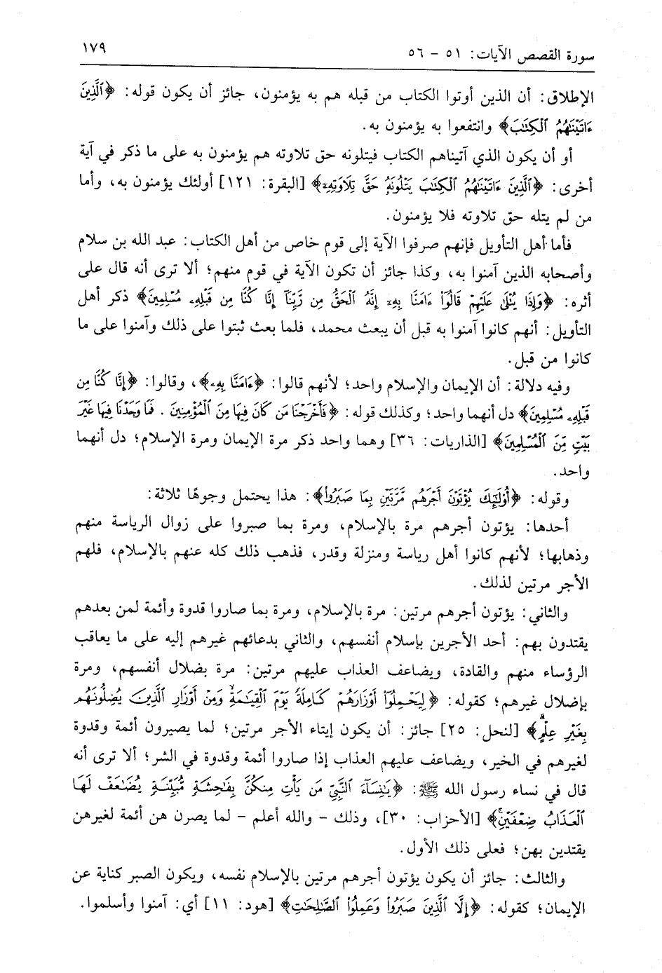 والثالث: جائز أن يكون يؤتون أجرهم مرتين بالإسلام نفسه، ويكون الصبر كناية عن الإيمان؛ كقوله: (إِلَّا الَّذِينَ صَبَرُوا وَعَمِلُوا الصَّالِحَاتِ) أي: آمنوا وأسلموا.