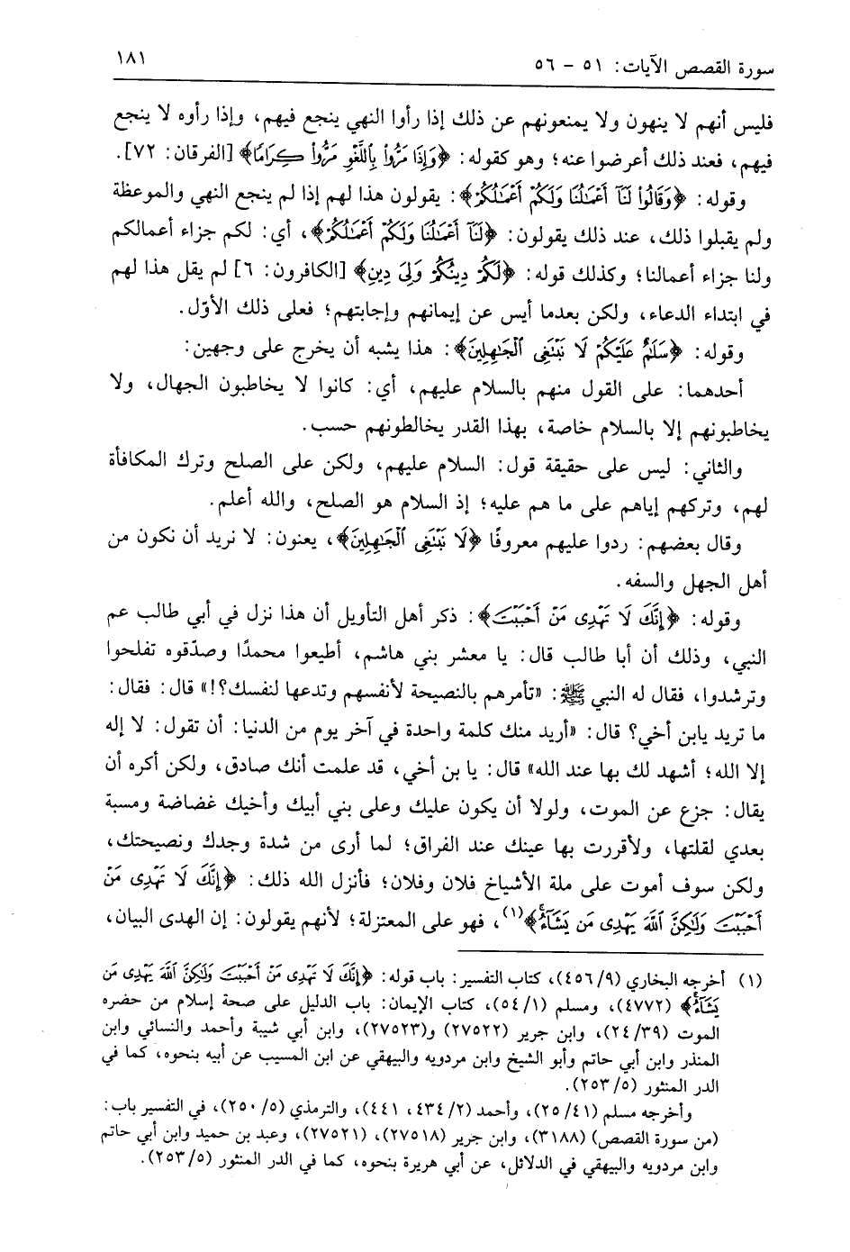 وقوله: (إِنَّكَ لَا تَهْدِي مَنْ أَحْبَبْتَ وَلَكِنَّ اللَّهَ يَهْدِي مَنْ يَشَاءُ وَهُوَ أَعْلَمُ بِالْمُهْتَدِينَ (56) ذكر أهل التأويل أن هذا نزل في أبي طالب عم النبي، وذلك أن أبا طالب قال: يا معشر بني هاشم، أطيعوا محمدًا وصدقوه تفلحوا وترشدوا، فقال له النبي - صَلَّى اللَّهُ عَلَيهِ وَسَلَّمَ -: " تأمرهم بالنصيحة لأنفسهم وتدعها لنفسك؟! " قال: فقال: ما تريد يا ابن أخي؟ قال: " أريد منك كلمة واحدة في آخر يوم من الدنيا: أن تقول: لا إله إلا اللَّه؛ أشهد لك بها عند اللَّه " قال: يا ابن أخي، قد علمت أنك صادق، ولكن أكره أن يقال: جزع عن الموت، ولولا أن يكون عليك وعلى بني أبيك وأخيك غضاضة ومسبة بعدي لقلتها، ولأقررت بها عينك عند الفراق؛ لما أرى من شدة وجدك ونصيحتك، ولكن سوف أموت على ملة الأشياخ فلان وفلان؛ فأنزل اللَّه ذلك: (إِنَّكَ لَا تَهْدِي مَنْ أَحْبَبْتَ وَلَكِنَّ اللَّهَ يَهْدِي مَنْ يَشَاءُ)، فهو على المعتزلة؛ لأنهم يقولون: أن الهدى البيان،