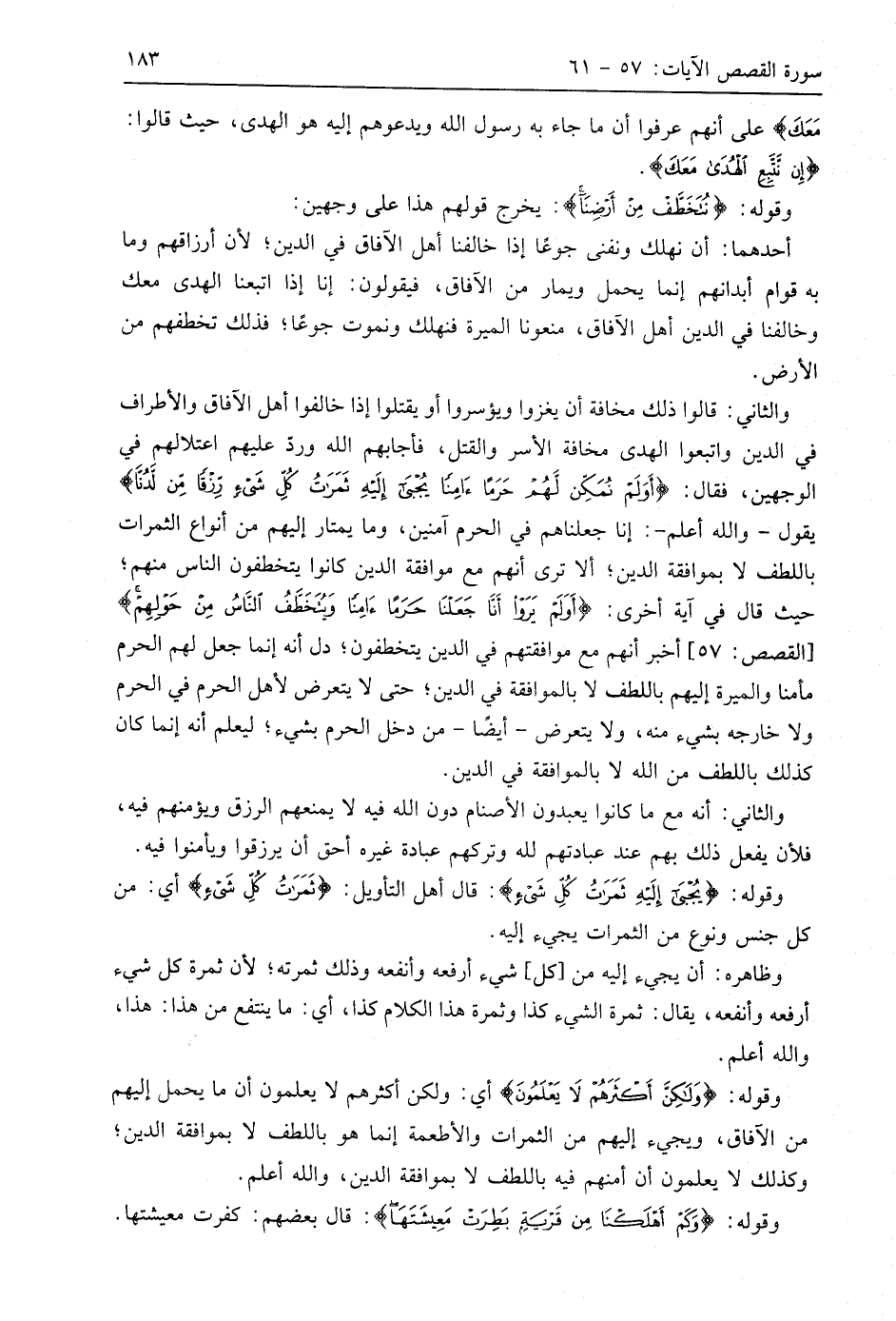والثاني: قالوا ذلك مخافة أن يغزوا ويؤسروا أو يقتلوا إذا خالفوا أهل الآفاق والأطراف في الدِّين واتبعوا الهدى مخافة الأسر والقتل، فأجابهم اللَّه ورد عليهم اعتلالهم في الوجهين، فقال: (أَوَلَمْ نُمَكِّنْ لَهُمْ حَرَمًا آمِنًا يُجْبَى إِلَيْهِ ثَمَرَاتُ كُلِّ شَيْءٍ رِزْقًا مِنْ لَدُنَّا) يقول - واللَّه أعلم -: إنا جعلناهم في الحرم آمنين، وما يمتار إليهم من أنواع الثمرات باللطف لا بموافقة الدِّين؛ ألا ترى أنهم مع موافقة الدِّين كانوا يتخطفون الناس منهم؛ حيث قال في آية أخرى: (أَوَلَمْ يَرَوْا أَنَّا جَعَلْنَا حَرَمًا آمِنًا وَيُتَخَطَّفُ النَّاسُ مِنْ حَوْلِهِمْ) أخبر أنهم مع موافقتهم في الدِّين يتخطفون؛ دل أنه إنما جعل لهم الحرم مأمنا والميرة إليهم باللطف لا بالموافقة في الدِّين؛ حتى لا يتعرض لأهل الحرم في الحرم ولا خارجه بشيء منه، ولا يتعرض -أيضًا- من دخل الحرم بشيء؛ ليعلم أنه إنما كان كذلك باللطف من اللَّه لا بالموافقة في الدِّين.