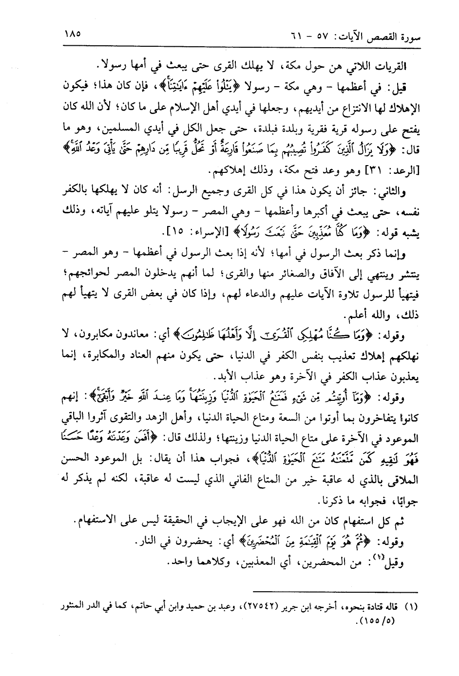 القريات اللاتي هن حول مكة، لا يهلك القرى حتى يبعث في أمها رسولا.