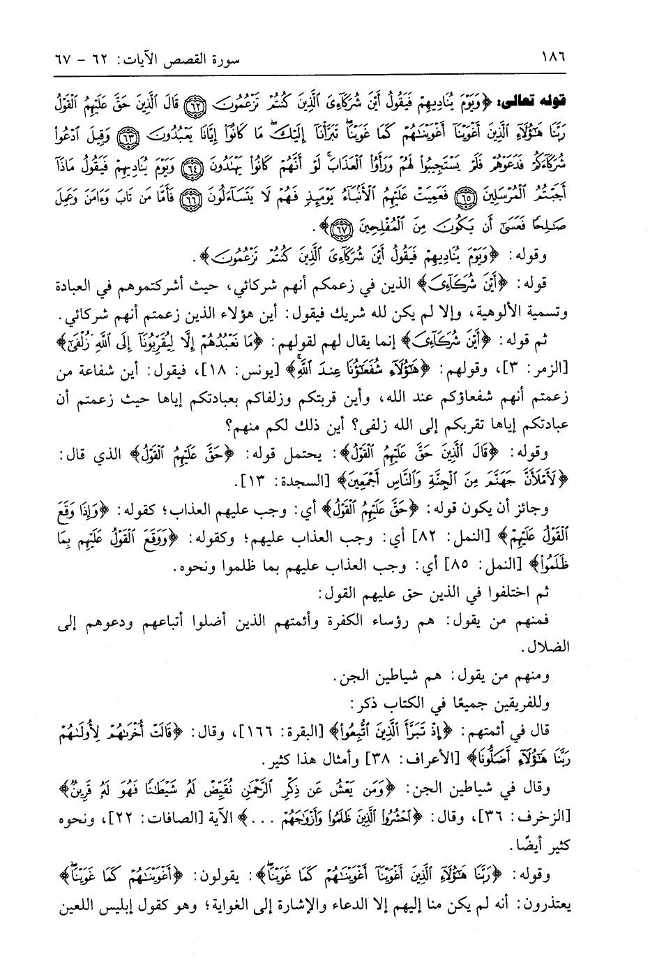 وقولِه: (قَالَ الَّذِينَ حَقَّ عَلَيْهِمُ الْقَوْلُ رَبَّنَا هَؤُلَاءِ الَّذِينَ أَغْوَيْنَا أَغْوَيْنَاهُمْ كَمَا غَوَيْنَا تَبَرَّأْنَا إِلَيْكَ مَا كَانُوا إِيَّانَا يَعْبُدُونَ (63) يحتمل قوله: (حَقَّ عَلَيْهِمُ الْقَوْلُ) الذي قال: (لَأَمْلَأَنَّ جَهَنَّمَ مِنْكُمْ أَجْمَعِينَ).