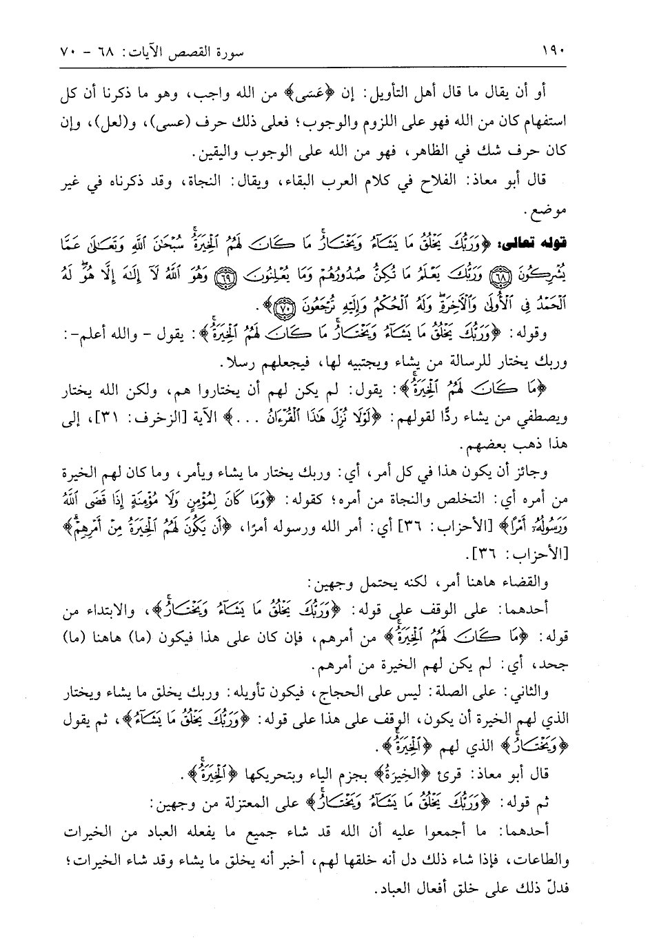 والثاني: على الصلة: ليس على الحجاج، فيكون تأويله: وربك يخلق ما يشاء ويختار الذي لهم الخيرة أن يكون، الوقف على هذا على قوله: (وَرَبُّكَ يَخْلُقُ مَا يَشَاءُ)، ثم يقول (وَيَخْتَارُ) الذي لهم (الْخِيَرَةُ).