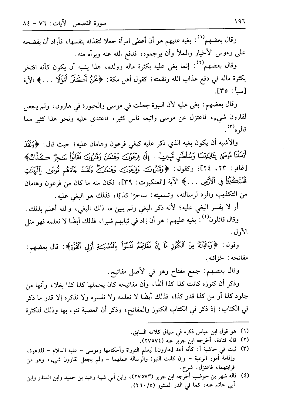 وقَالَ بَعْضُهُمْ: بغى عليه لأن النبوة جعلت في موسى والحبورة في هارون، ولم يجعل لقارون شيء، فاعتزل عن موسى واتبعه ناس كثير، فاعتدى عليه ونحو هذا كثير مما قالوه.
