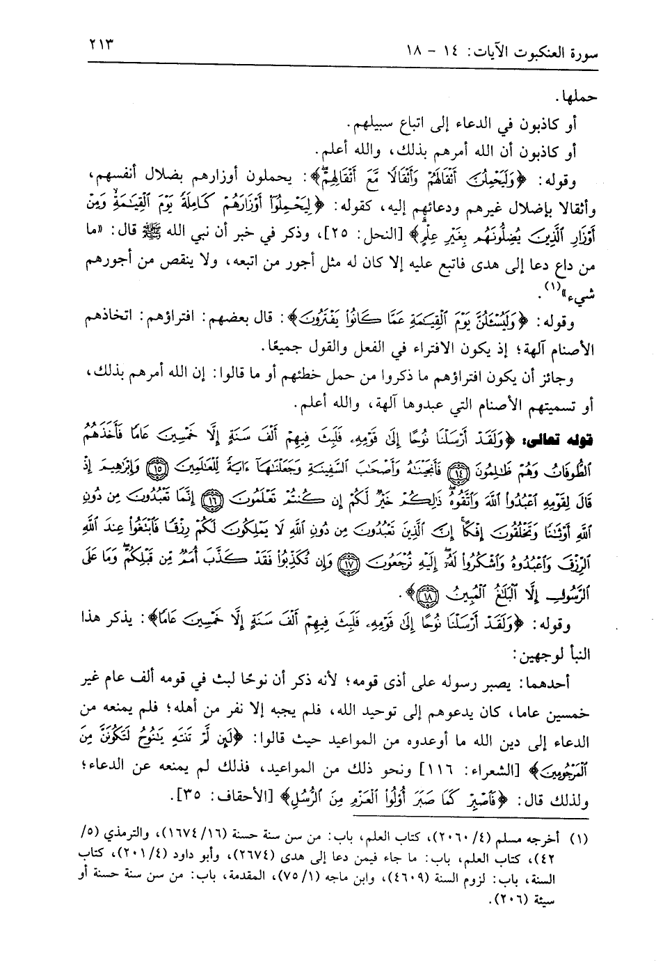 قوله تعالى: (وَلَقَدْ أَرْسَلْنَا نُوحًا إِلَى قَوْمِهِ فَلَبِثَ فِيهِمْ أَلْفَ سَنَةٍ إِلَّا خَمْسِينَ عَامًا فَأَخَذَهُمُ الطُّوفَانُ وَهُمْ ظَالِمُونَ (14) فَأَنْجَيْنَاهُ وَأَصْحَابَ السَّفِينَةِ وَجَعَلْنَاهَا آيَةً لِلْعَالَمِينَ (15) وَإِبْرَاهِيمَ إِذْ قَالَ لِقَوْمِهِ اعْبُدُوا اللَّهَ وَاتَّقُوهُ ذَلِكُمْ خَيْرٌ لَكُمْ إِنْ كُنْتُمْ تَعْلَمُونَ (16) إِنَّمَا تَعْبُدُونَ مِنْ دُونِ اللَّهِ أَوْثَانًا وَتَخْلُقُونَ إِفْكًا إِنَّ الَّذِينَ تَعْبُدُونَ مِنْ دُونِ اللَّهِ لَا يَمْلِكُونَ لَكُمْ رِزْقًا فَابْتَغُوا عِنْدَ اللَّهِ الرِّزْقَ وَاعْبُدُوهُ وَاشْكُرُوا لَهُ إِلَيْهِ تُرْجَعُونَ (17) وَإِنْ تُكَذِّبُوا فَقَدْ كَذَّبَ أُمَمٌ مِنْ قَبْلِكُمْ وَمَا عَلَى الرَّسُولِ إِلَّا الْبَلَاغُ الْمُبِينُ (18)