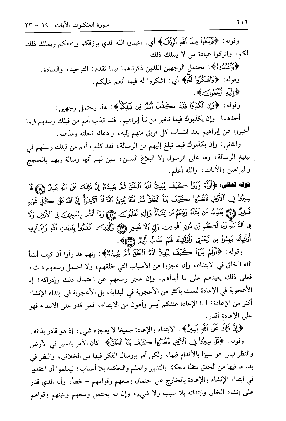 قوله تعالى: (أَوَلَمْ يَرَوْا كَيْفَ يُبْدِئُ اللَّهُ الْخَلْقَ ثُمَّ يُعِيدُهُ إِنَّ ذَلِكَ عَلَى اللَّهِ يَسِيرٌ (19) قُلْ سِيرُوا فِي الْأَرْضِ فَانْظُرُوا كَيْفَ بَدَأَ الْخَلْقَ ثُمَّ اللَّهُ يُنْشِئُ النَّشْأَةَ الْآخِرَةَ إِنَّ اللَّهَ عَلَى كُلِّ شَيْءٍ قَدِيرٌ (20) يُعَذِّبُ مَنْ يَشَاءُ وَيَرْحَمُ مَنْ يَشَاءُ وَإِلَيْهِ تُقْلَبُونَ (21) وَمَا أَنْتُمْ بِمُعْجِزِينَ فِي الْأَرْضِ وَلَا فِي السَّمَاءِ وَمَا لَكُمْ مِنْ دُونِ اللَّهِ مِنْ وَلِيٍّ وَلَا نَصِيرٍ (22) وَالَّذِينَ كَفَرُوا بِآيَاتِ اللَّهِ وَلِقَائِهِ أُولَئِكَ يَئِسُوا مِنْ رَحْمَتِي وَأُولَئِكَ لَهُمْ عَذَابٌ أَلِيمٌ (23)