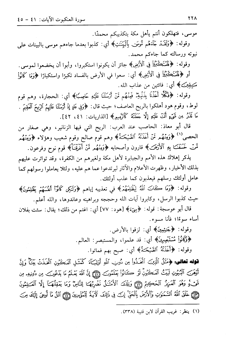 قال أبو معاذ: الحاصب عند العرب: الريح التي فيها الزنانير، وهي صغار من الحصى (وَمِنْهُمْ مَنْ أَخَذَتْهُ الصَّيْحَةُ) وهم قوم صالح وقوم شعيب وهَؤُلَاءِ (وَمِنْهُمْ مَنْ خَسَفْنَا بِهِ الْأَرْضَ) قارون وأصحابه (وَمِنْهُمْ مَنْ أَغْرَقْنَا) قوم نوح وفرعون.
