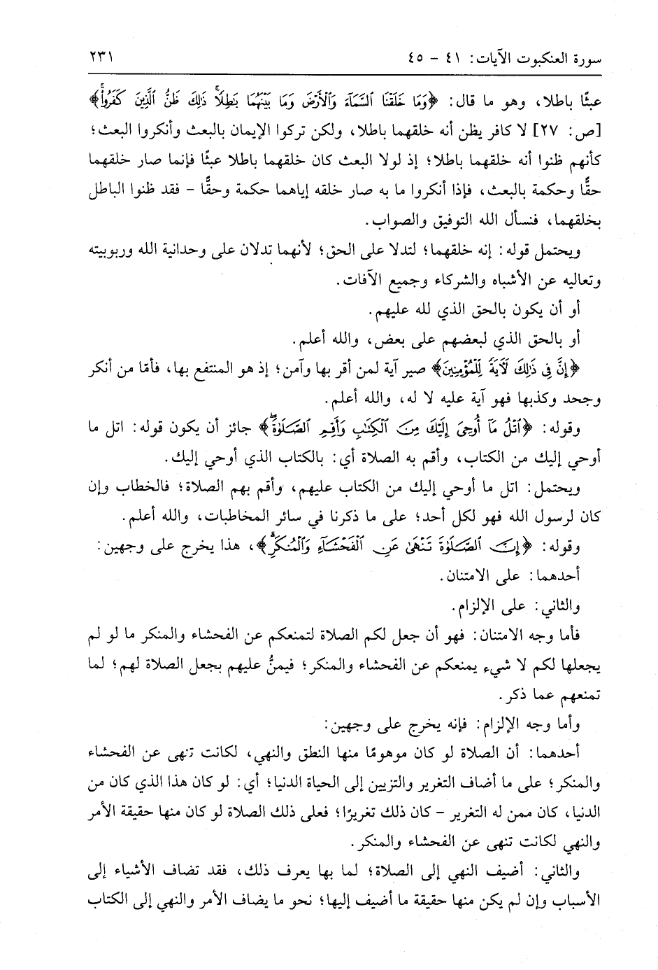 وقوله: (اتْلُ مَا أُوحِيَ إِلَيْكَ مِنَ الْكِتَابِ وَأَقِمِ الصَّلَاةَ إِنَّ الصَّلَاةَ تَنْهَى عَنِ الْفَحْشَاءِ وَالْمُنْكَرِ وَلَذِكْرُ اللَّهِ أَكْبَرُ وَاللَّهُ يَعْلَمُ مَا تَصْنَعُونَ (45) جائز أن يكون قوله: اتل ما أوحي إليك من الكتاب، وأقم به الصلاة أي: بالكتاب الذي أوحي إليك.