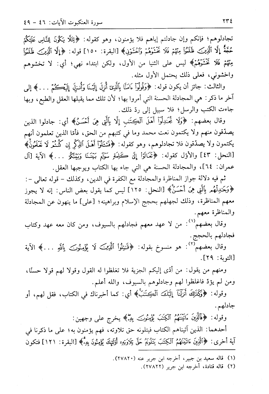 وقَالَ بَعْضُهُمْ: (وَلَا تُجَادِلُوا أَهْلَ الْكِتَابِ إِلَّا بِالَّتِي هِيَ أَحْسَنُ) أي: جادلوا الذين يصدقون منهم ولا يكتمون نعت مُحَمَّد وما في كتبهم من الحق، فأمَّا الذين تعلمون أنهم يكتمون ولا يصدقون فلا تجادلوهم، وهو كقوله: (فَاسْأَلُوا أَهْلَ الذِّكْرِ إِنْ كُنْتُمْ لَا تَعْلَمُونَ) والأوّل كقوله: (تَعَالَوْا إِلَى كَلِمَةٍ سَوَاءٍ بَيْنَنَا وَبَيْنَكُمْ. . .) الآية.