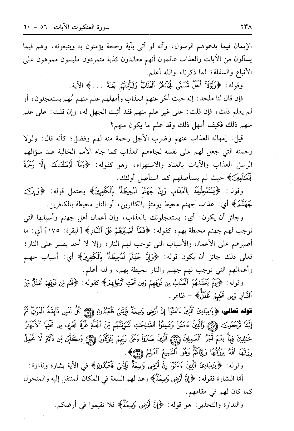 وقوله: (يَسْتَعْجِلُونَكَ بِالْعَذَابِ وَإِنَّ جَهَنَّمَ لَمُحِيطَةٌ بِالْكَافِرِينَ (54) يحتمل قوله: (وَإِنَّ جَهَنَّمَ لَمُحِيطَةٌ) أي: عذاب جهنم محيط يومئدٍ بالكافرين، أو النار محيطة بالكافرين.